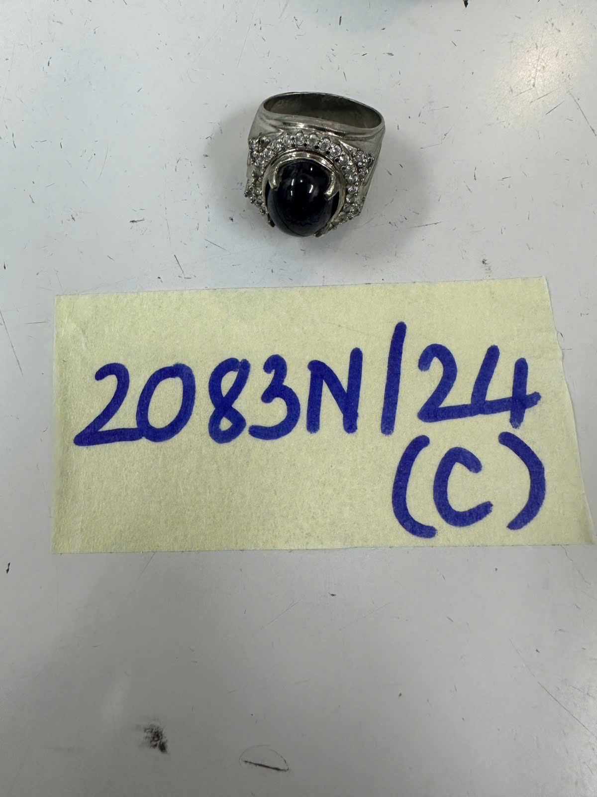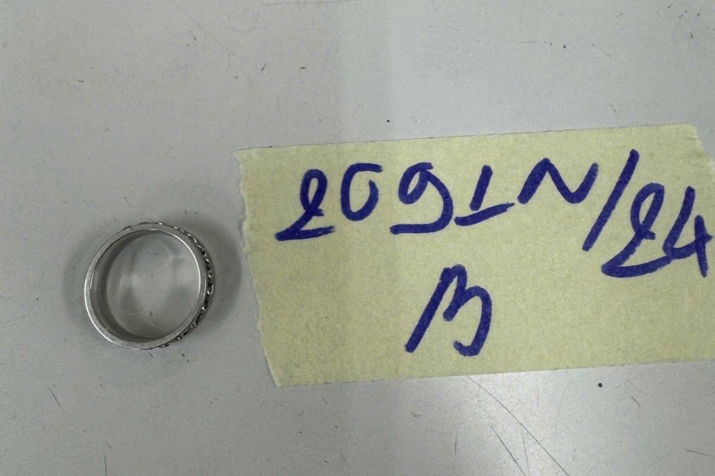 Ngày tiếp nhận: 04/12/2024 Mã hồ sơ: 2080N2024A Mô tả: 01 chiếc nhẫn bằng kim loại màu trắng đính đá mặt ngoài, bên trong khắc số 925. |