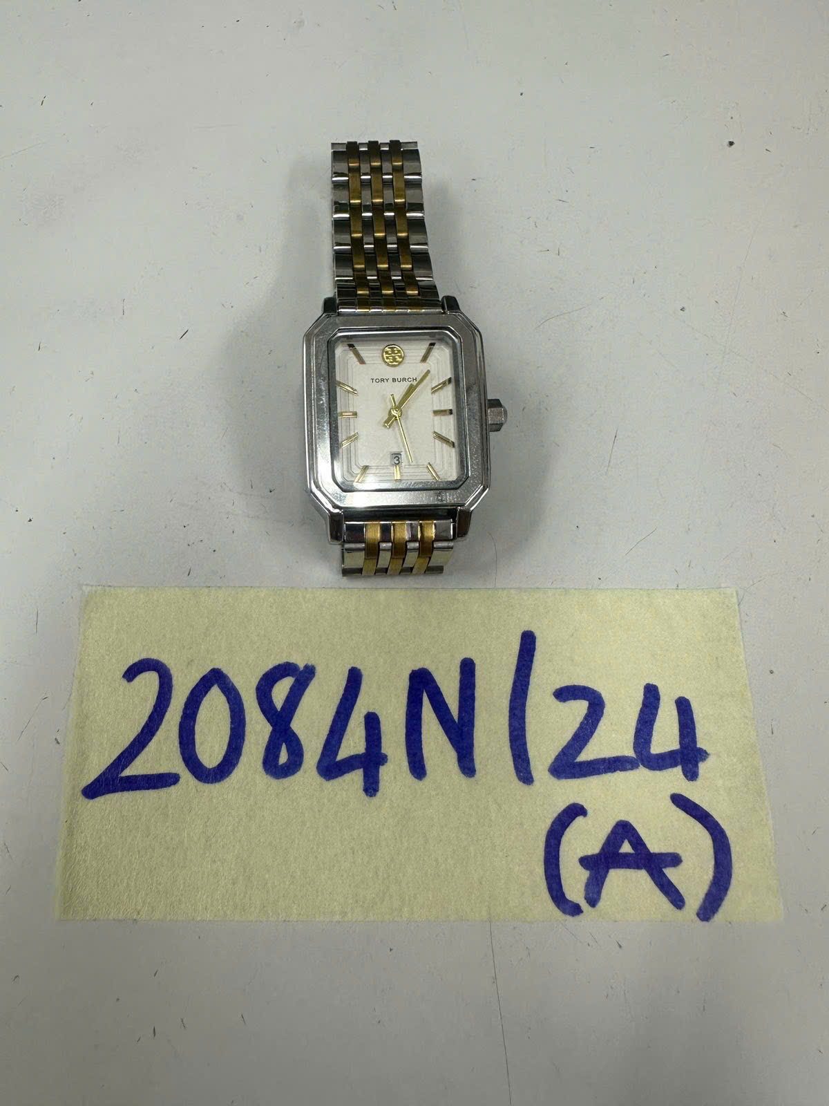 Ngày tiếp nhận: 04/12/2024 Mã hồ sơ: 2084N2024A Mô tả: 01 đồng hồ kim loại, dây đeo kim loại màu bạc vàng, trên đồng hồ có chữ TORY BURCH. |