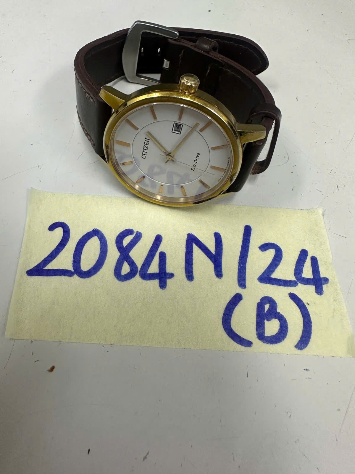 Ngày tiếp nhận: 04/12/2024 Mã hồ sơ: 2084N2024B Mô tả: 01 đồng hồ kim loại, dây đeo da màu nâu, trên đồng hồ có chữ CITIZEN. |
