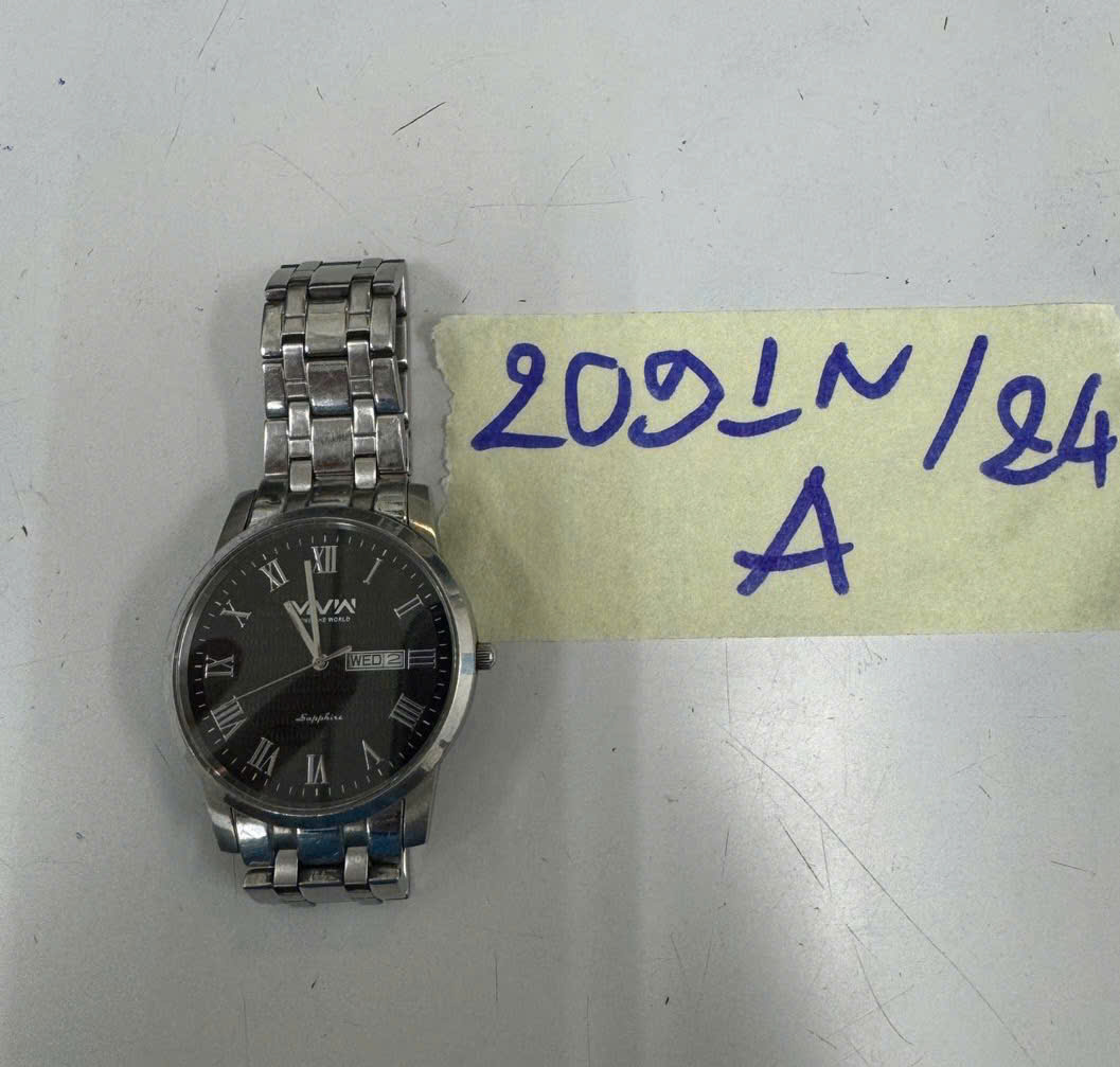 Ngày tiếp nhận: 04/12/2024 Mã hồ sơ: 2091N2024A Mô tả: 01 đồng hồ kim loại màu bạc, mặt hình tròn có chữ MVW. |