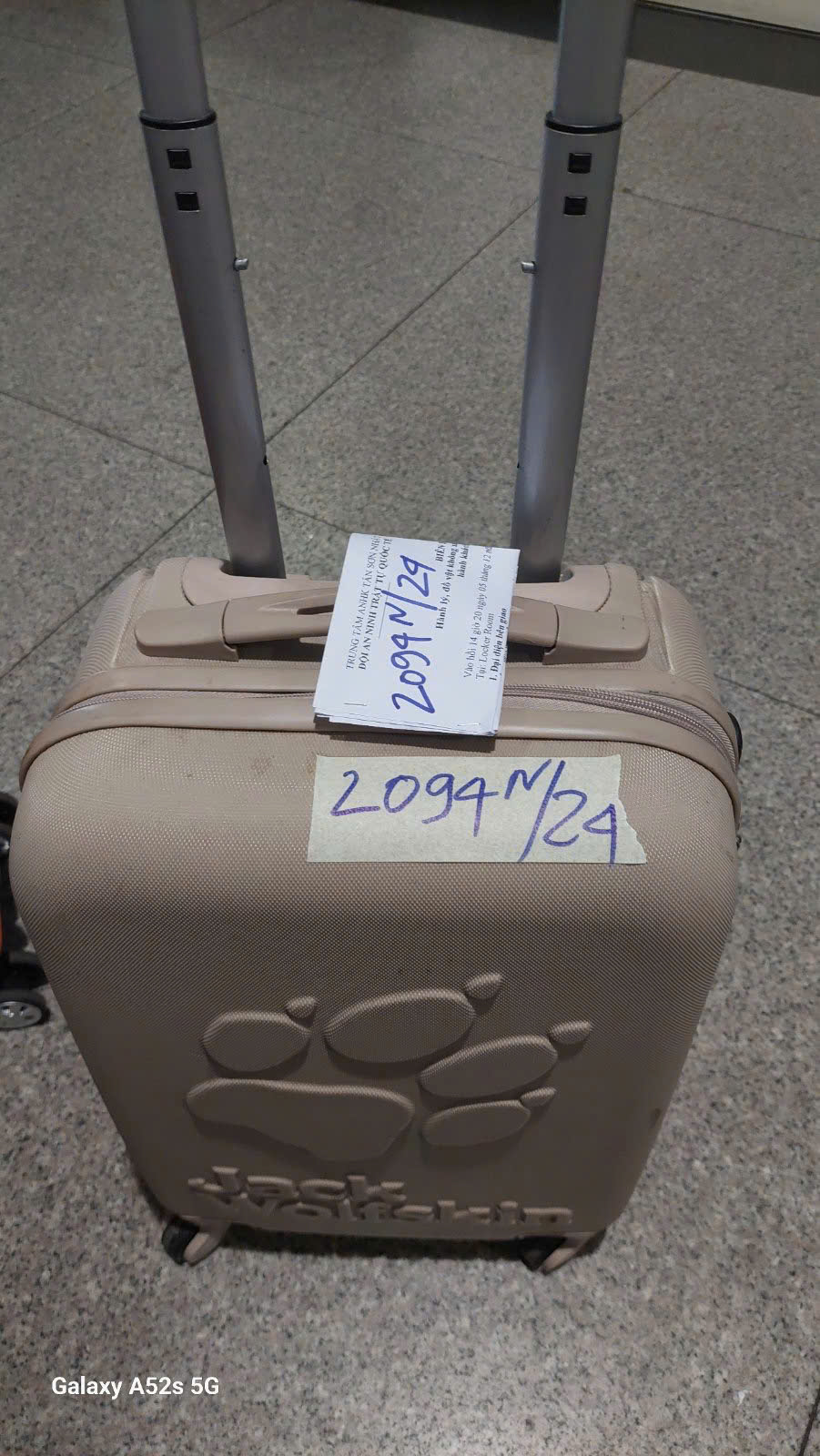 Ngày tiếp nhận: 04/12/2024 Mã hồ sơ: 2085N2024E Mô tả: 01 túi xách màu đen có chữ CG bên trong có: - 01 điện thoại màu bạc SAMSUNG, có ốp lưng trong suốt - 01 túi màu tím bên trong có một số nữ trang kim loại màu vàng và trắng bạc - 01 ví màu vàng có chữ CALIFORNIA có: 01 tờ 100.000 VNĐ, 04 tờ 5 USD, 04 tờ 1 USD, 01 tờ 50 Shekels và một số đồ cá nhân. |