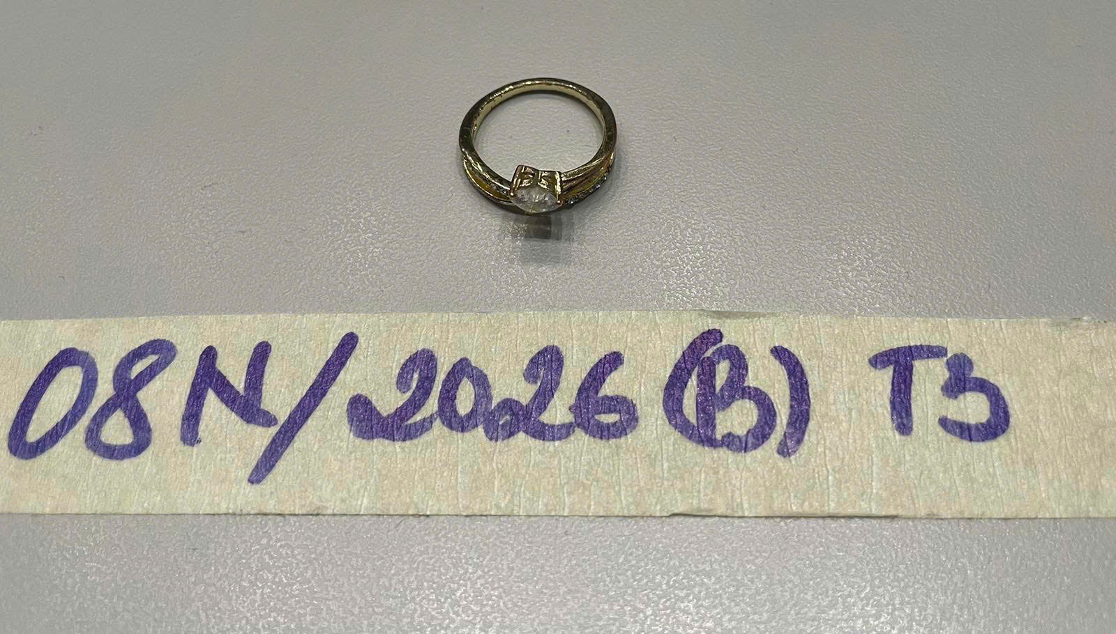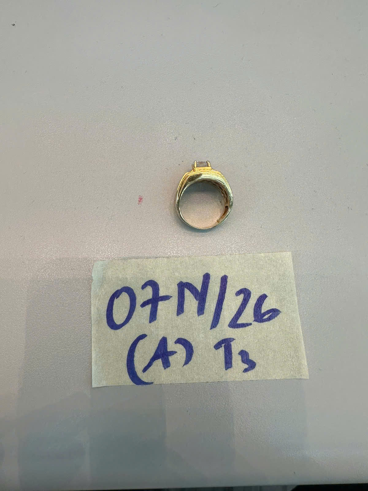 Ngày tiếp nhận: 06/01/2026 Mã hồ sơ: 07N2026A Mô tả: 01 nhẫn kim loại màu vàng, có đính đá màu trắng hình tròn, xung quanh đính đá nhỏ hình tròn màu trắng. |