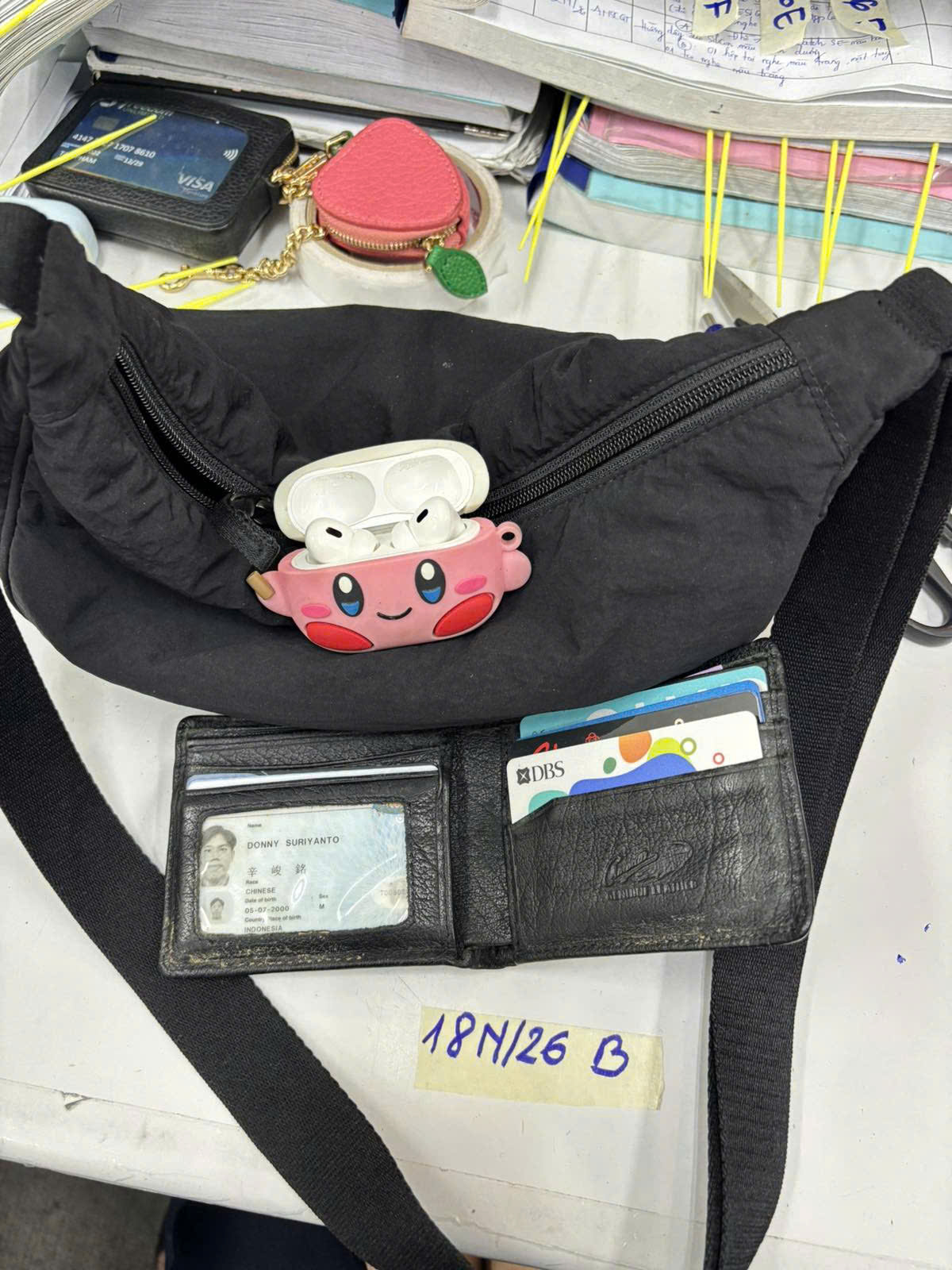 Ngày tiếp nhận: 07/01/2026 Mã hồ sơ: 18N2026B Mô tả: 01 túi vải màu đen bên trong gồm 01 hộp tai nghe AIRPODS và 01 ví da màu đen có giấy tờ mang tên DONNY SURIYANTO. |