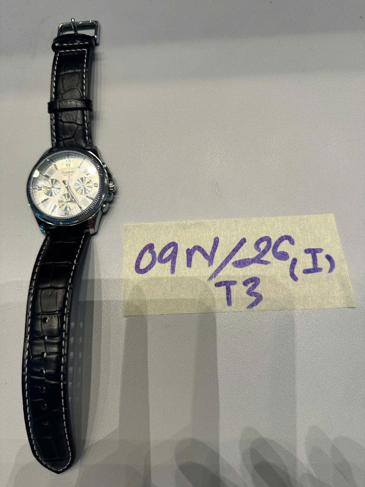 Ngày tiếp nhận: 07/01/2026 Mã hồ sơ: 09N2026I Mô tả: 01 đồng hồ dây da màu đen có chữ CASIO. |