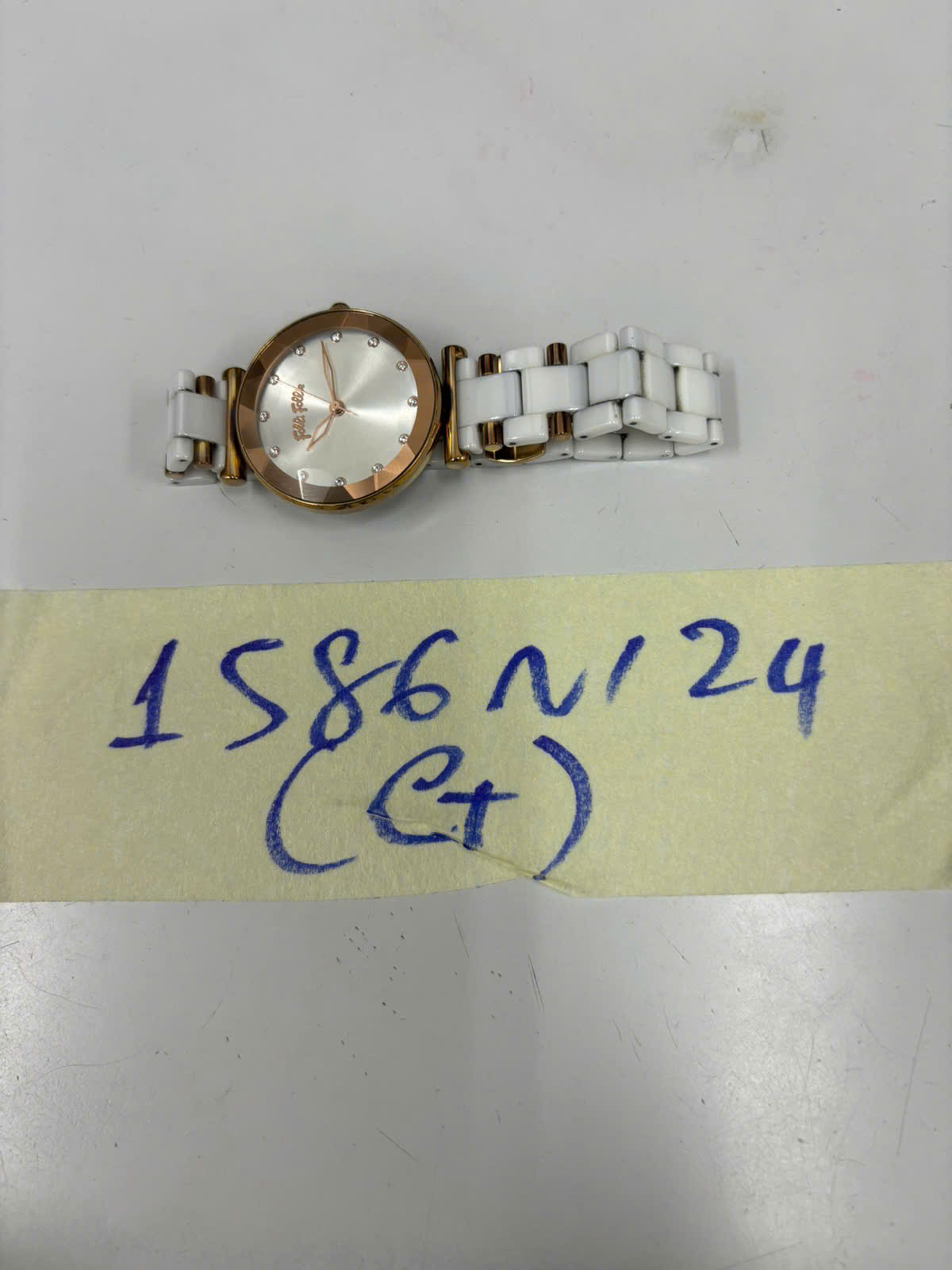 Ngày tiếp nhận: 19/9/2024 Mã hồ sơ: 1586N2024G Mô tả: 01 đồng hồ KL dây trắng, mặt tròn màu vàng chữ Folli Folie. |