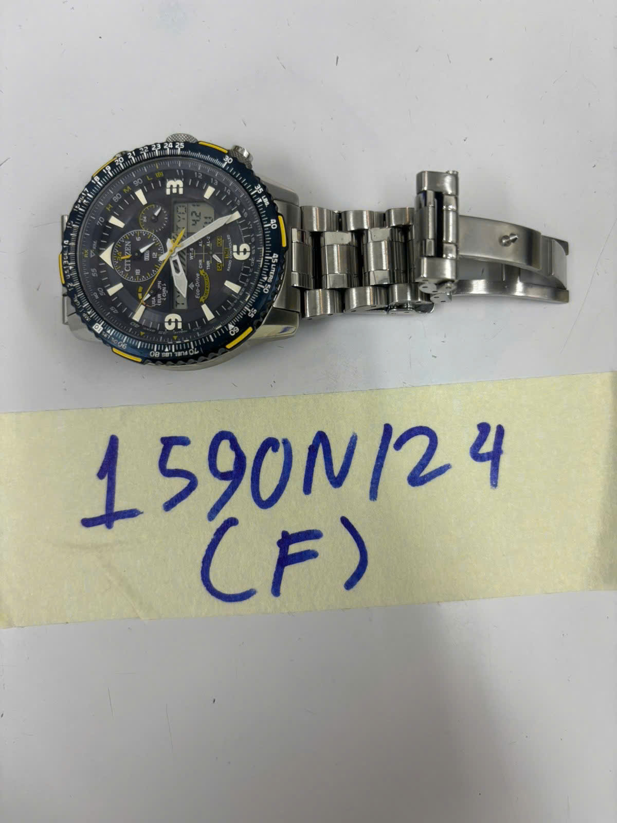 Ngày tiếp nhận: 20/9/2024 Mã hồ sơ: 1590N2024F Mô tả: 01 đồng hồ màu bạc dây KL, mặt đồng hồ màu đen chữ Citizen. |