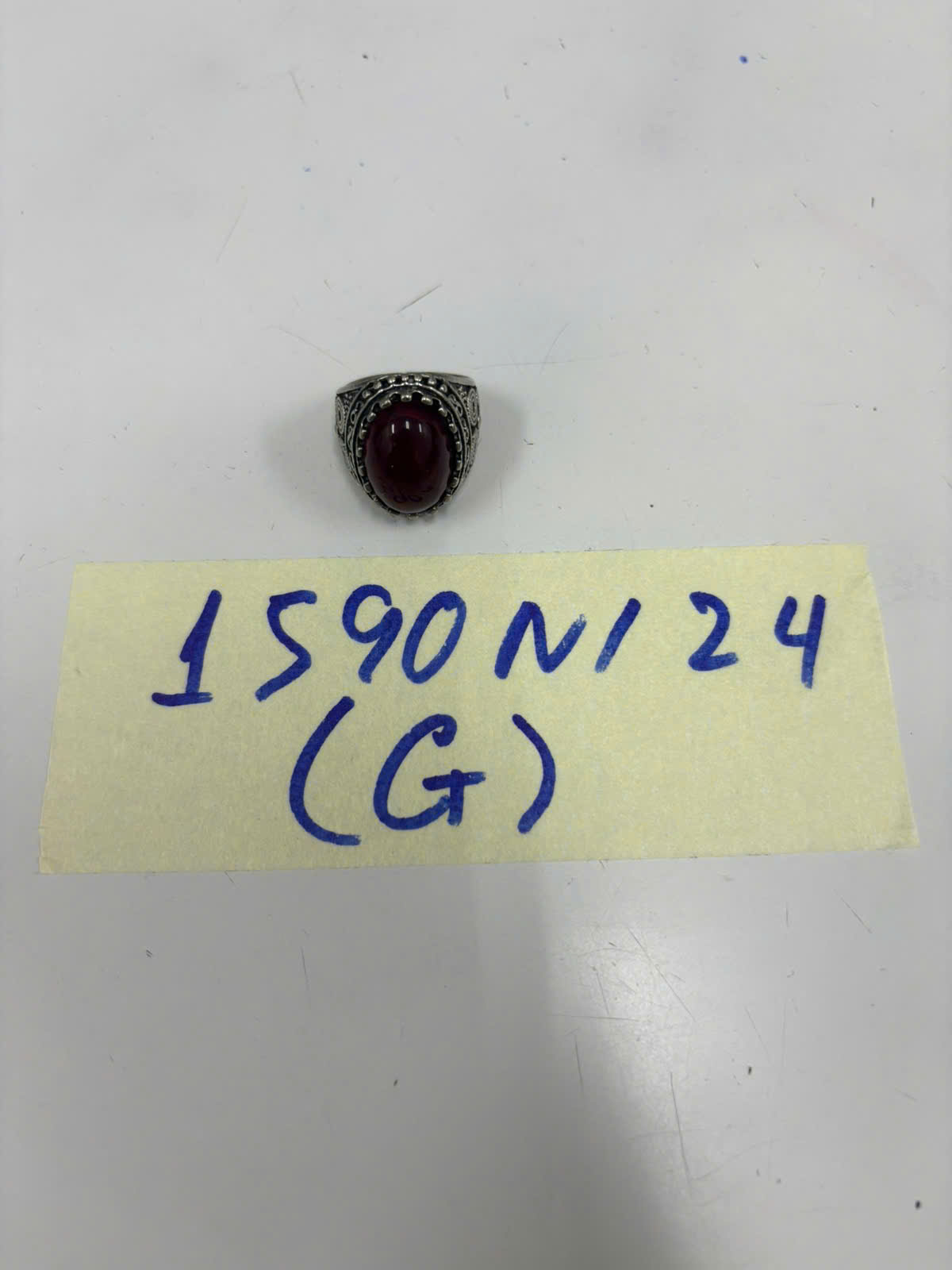Ngày tiếp nhận: 20/9/2024 Mã hồ sơ: 1590N2024G Mô tả: 01 nhẫn màu bạc có đính hạt màu đỏ. |