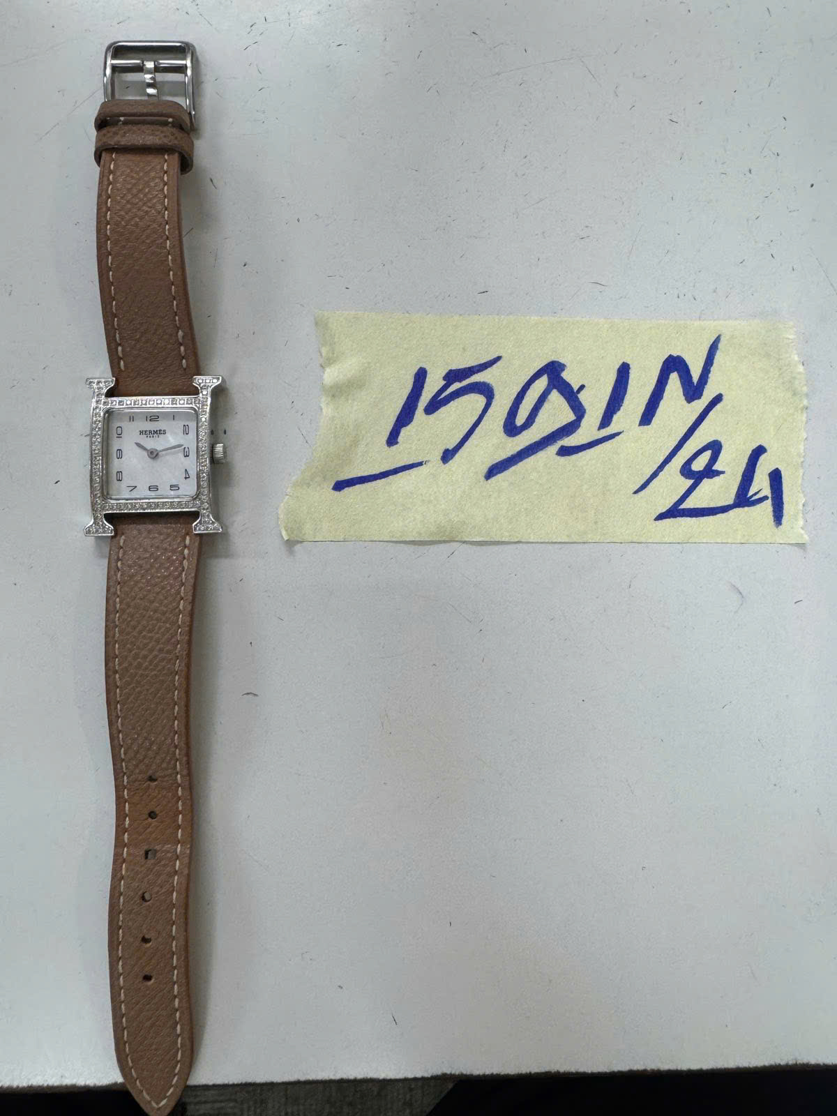Ngày tiếp nhận: 21/9/2024 Mã hồ sơ: 1591N2024 Mô tả: 01 đồng hồ đeo tay có mặt bằng KL hình chữ H màu bạc có đính nhiều hạt, logo chữ “HERMES”, mặt sau chữ HH1.201, dây đeo da màu nâu. |