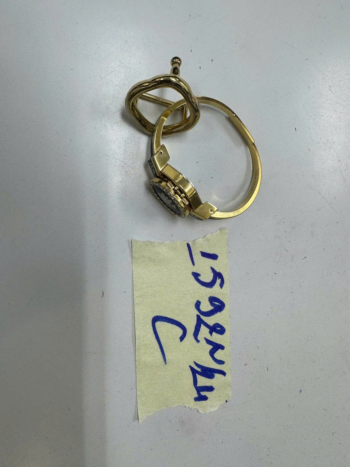 Ngày tiếp nhận: 21/9/2024 Mã hồ sơ: 1592N2024C Mô tả: 01 đồng hồ đeo tay KL màu vàng có nắp phía trên mặt đồng hồ đính đá màu trắng (Andre Mouche Swiss made). |