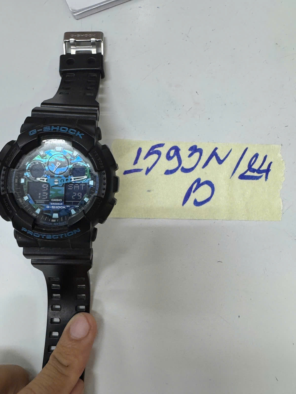 Ngày tiếp nhận: 21/9/2024 Mã hồ sơ: 1593N2024B Mô tả: 01 đồng hồ đeo tay màu đen, dây đeo cao su màu đen, mặt đồng hồ chữ G-Shock. |