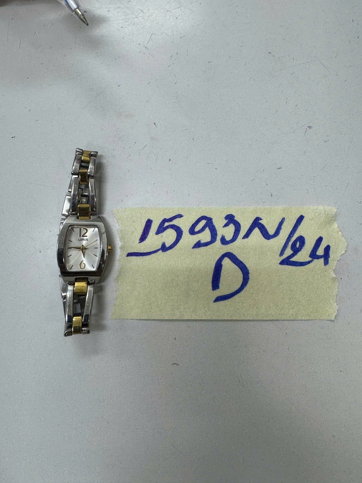 Ngày tiếp nhận: 21/9/2024 Mã hồ sơ: 1593N2024D Mô tả: 01 đồng hồ màu xám, dây đeo KL màu xám và vàng có chữ LORUS. |