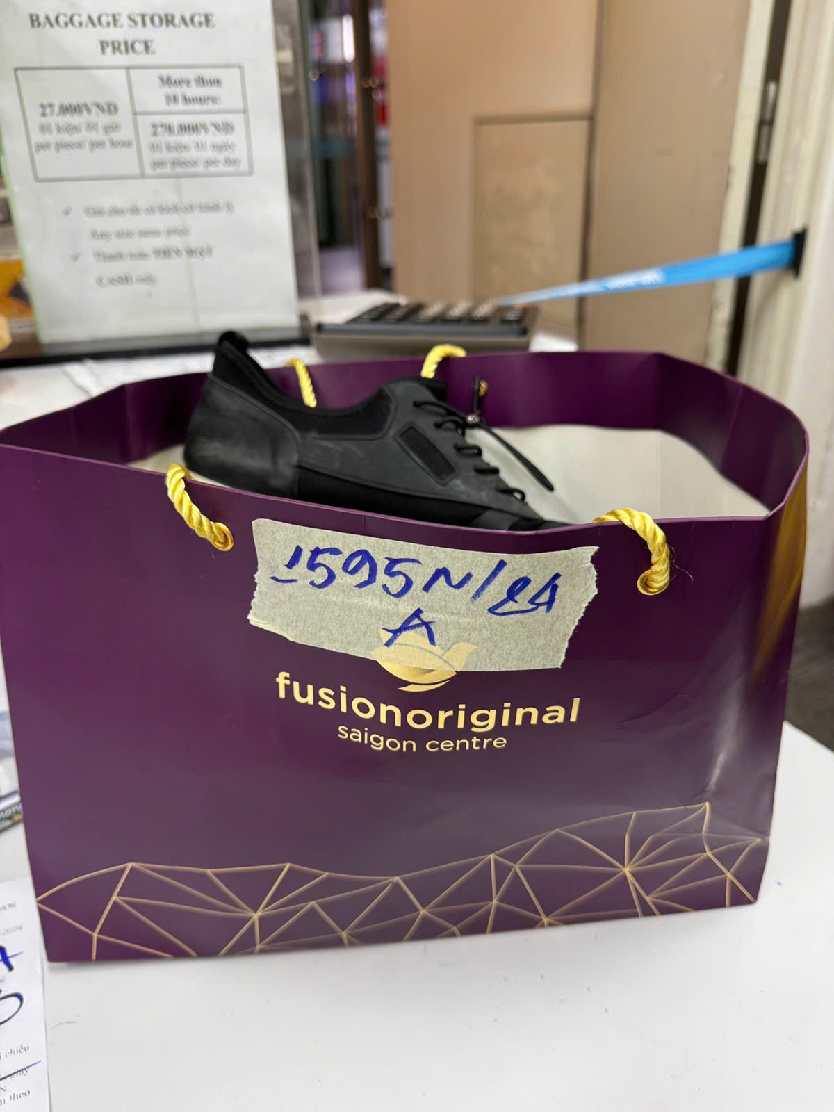 Ngày tiếp nhận: 21/9/2024 Mã hồ sơ: 1595N2024A Mô tả: 01 túi giấy màu tím có chữ Fusionoriginal gồm: 01 đôi giày màu đen chữ HOKA+01 đôi giày màu đen chữ AOEACARMON. |