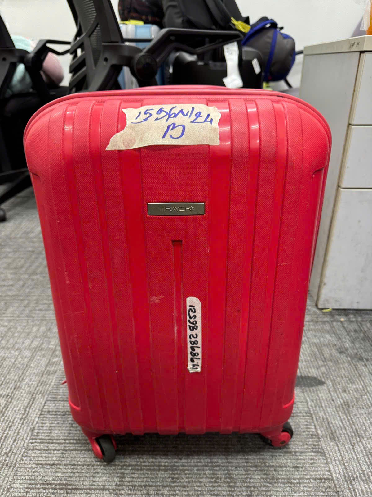 Ngày tiếp nhận: 21/9/2024 Mã hồ sơ: 1596N2024B Mô tả: 01 vali màu đỏ, hiêu TRACK có bánh kẹo. |