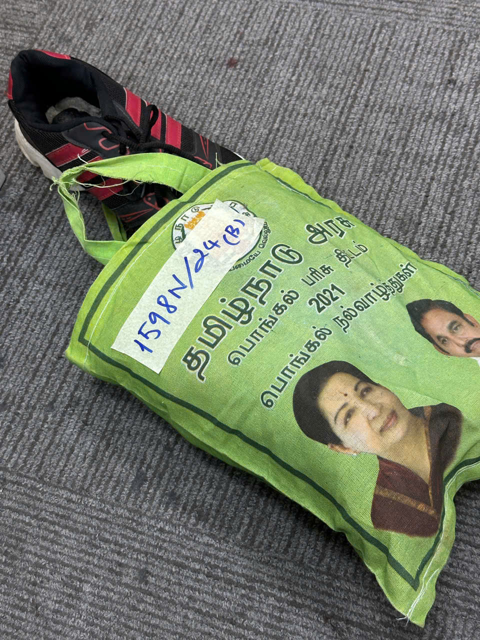 Ngày tiếp nhận: 21/9/2024 Mã hồ sơ: 1598N2024B Mô tả: 01 túi vải màu xanh có 01 đôi giày màu đỏ ADLDAS. |