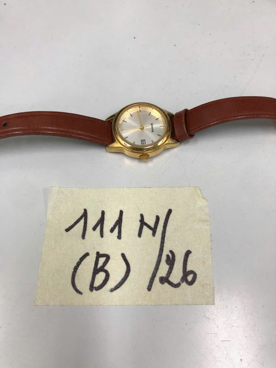 Ngày tiếp nhận: 21/01/2026 Mã hồ sơ: 111N2026B Mô tả: 01 đồng hồ mặt hình tròn màu vàng có chữ SONATA, dây đeo da màu nâu. |