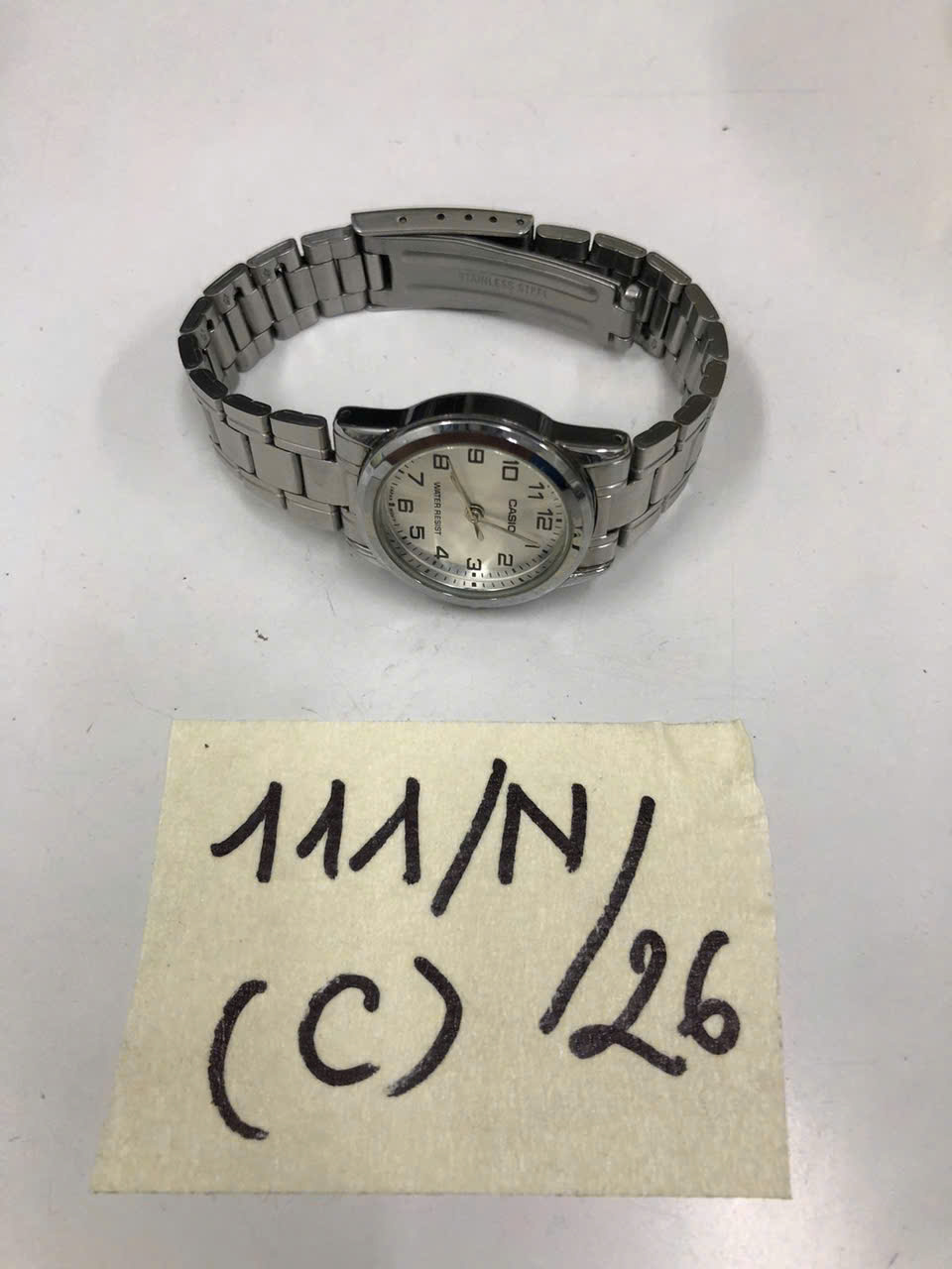Ngày tiếp nhận: 21/01/2026 Mã hồ sơ: 111N2026C Mô tả: 01 đồng hồ mặt hình tròn màu trắng có chữ CASIO, dây đeo kim loại màu trắng. |