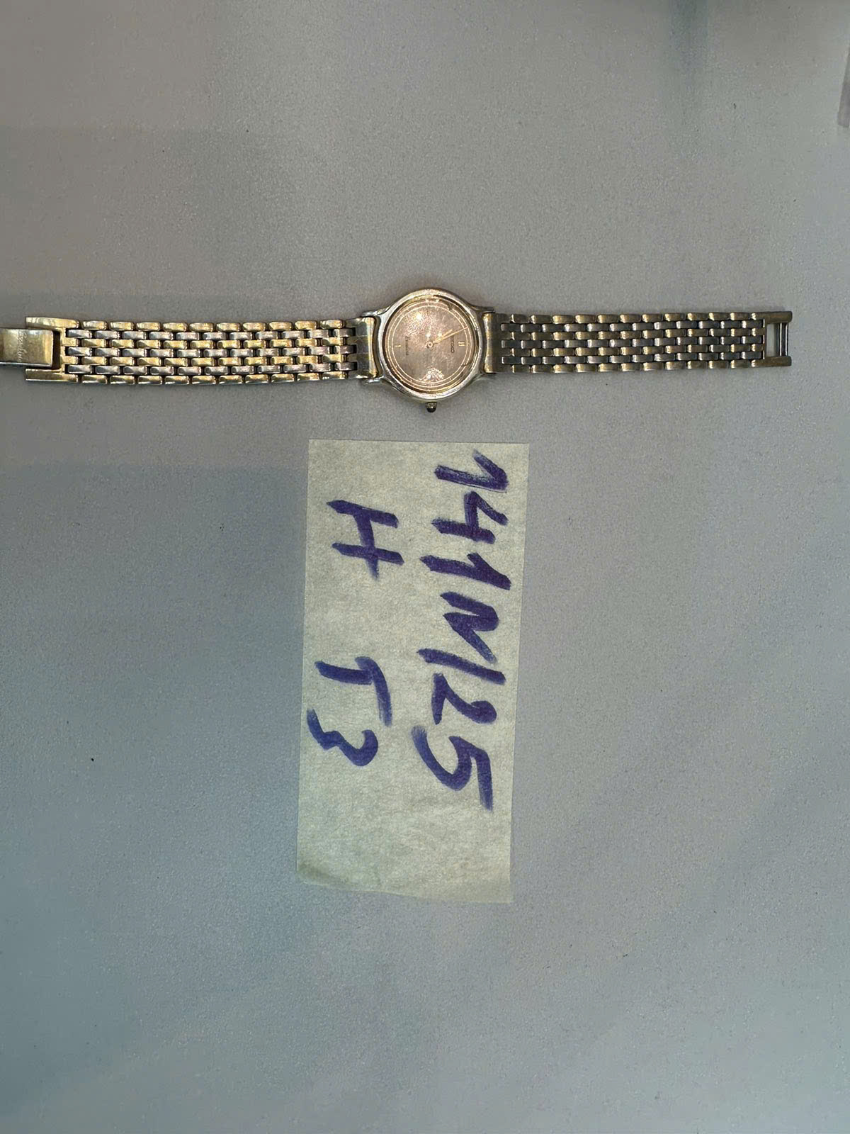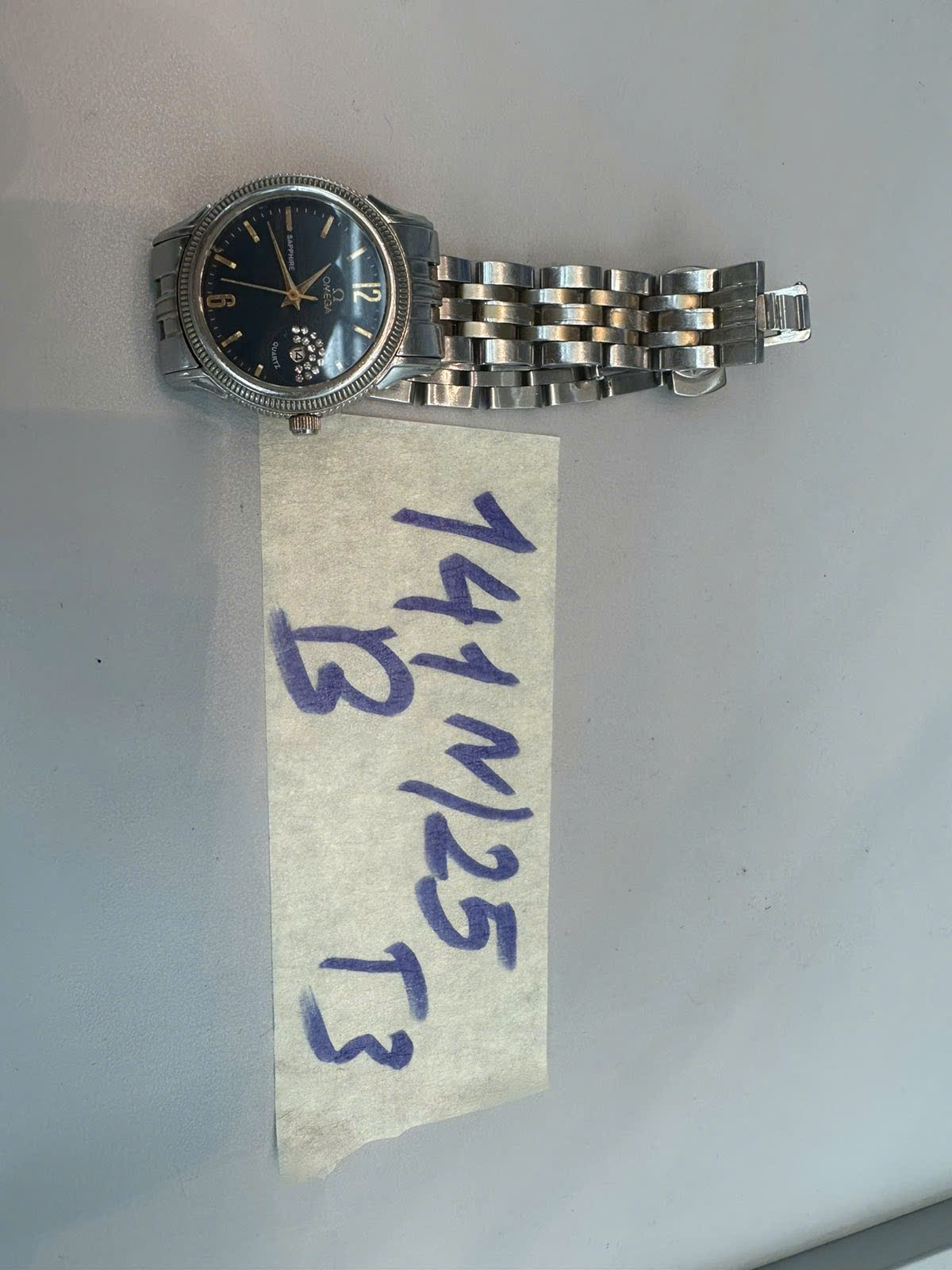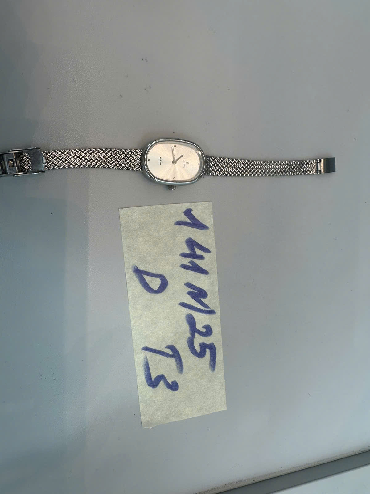 Ngày tiếp nhận: 21/12/2025 Mã hồ sơ: 141N2025B Mô tả: 01 đồng hồ dây kim loại màu bạc có chữ Omega. |