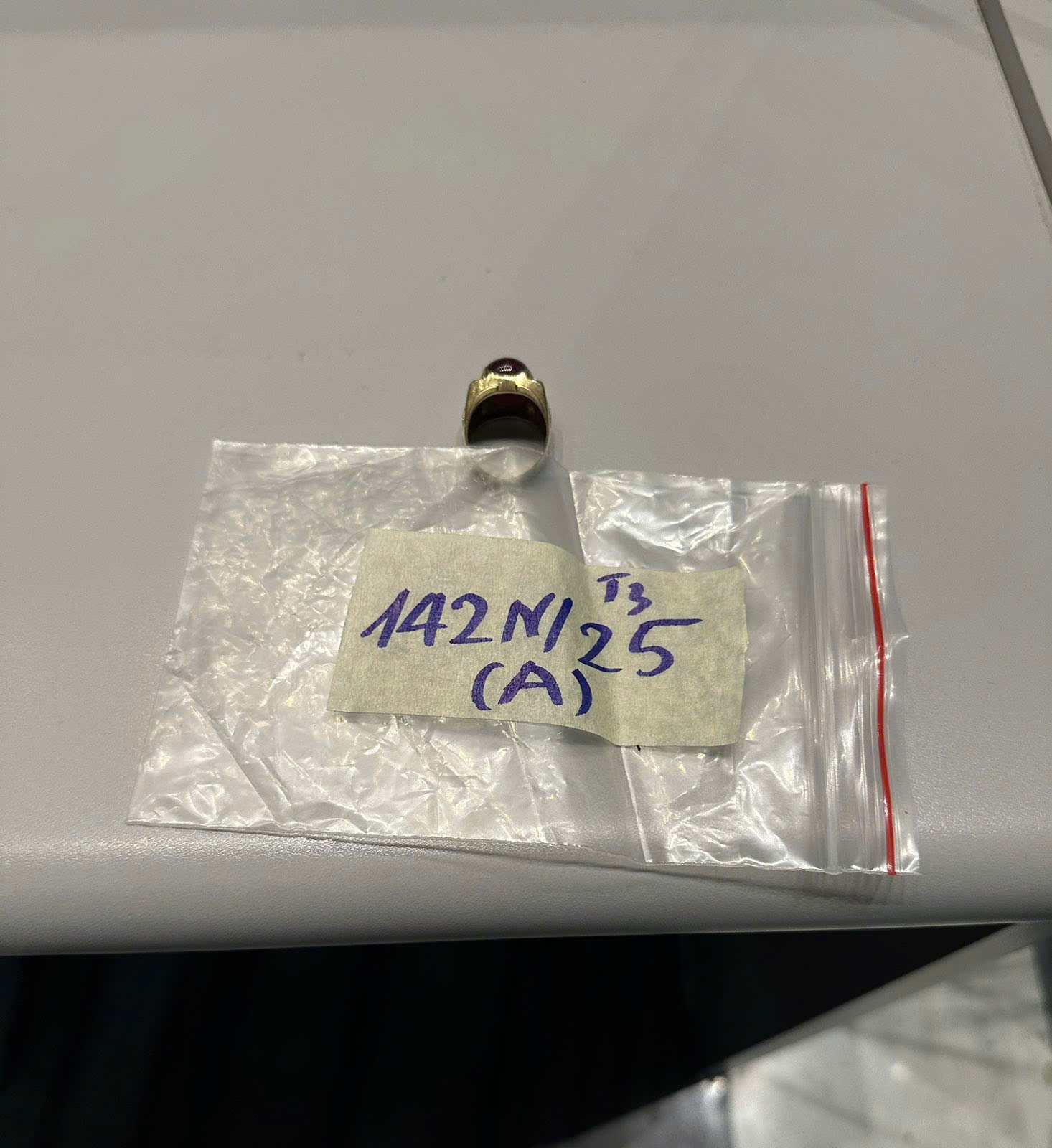 Ngày tiếp nhận: 21/12/2025 Mã hồ sơ: 142N2025A Mô tả: 01 nhẫn kim loại màu vàng có đính đá màu hồng. |