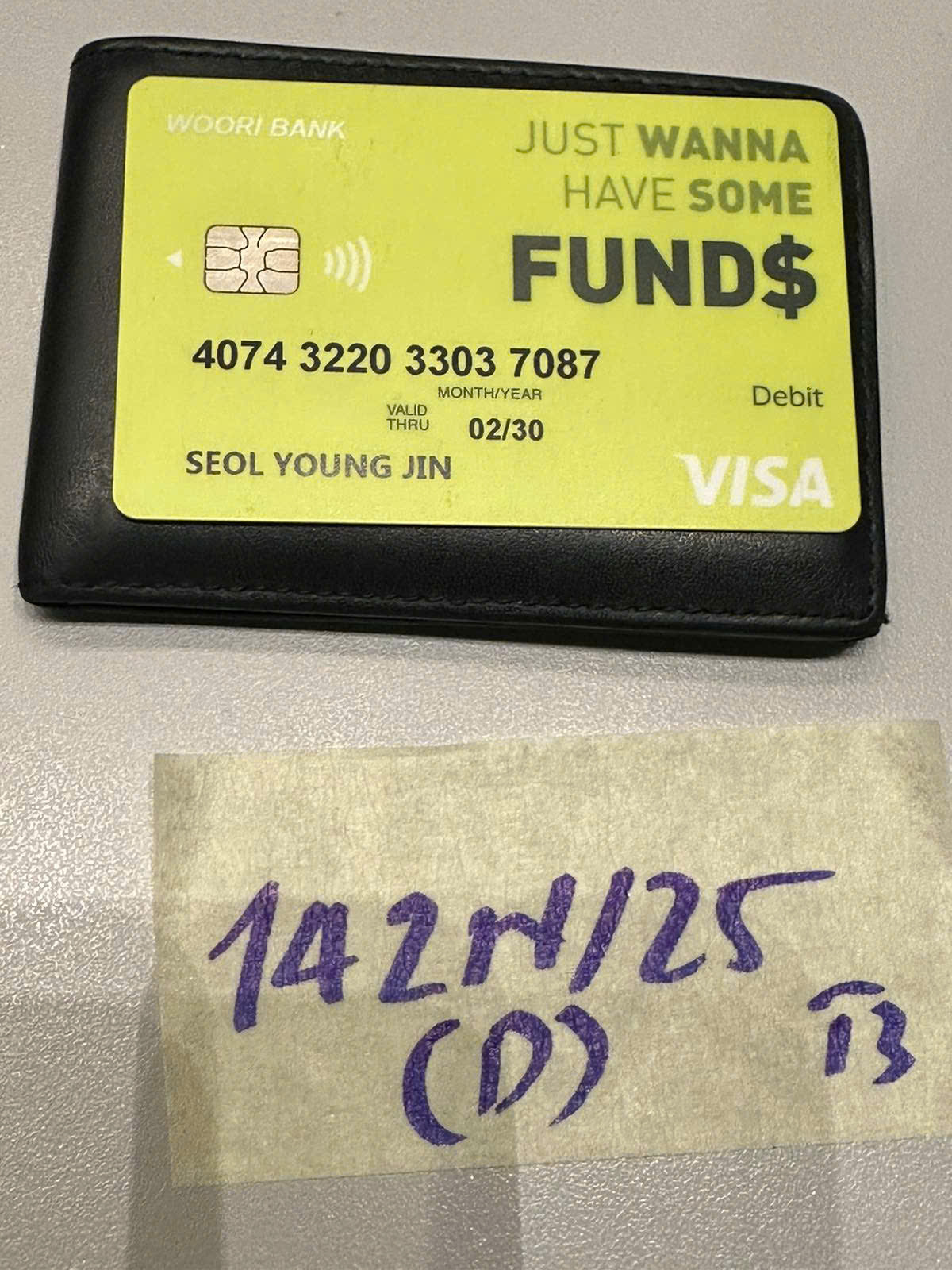 Ngày tiếp nhận: 21/12/2025 Mã hồ sơ: 142N2025D Mô tả: 01 bóp da màu xanh đen có chữ Petro bên trong không có tiền, thẻ ngân hàng có tên Seol Young Jin. |