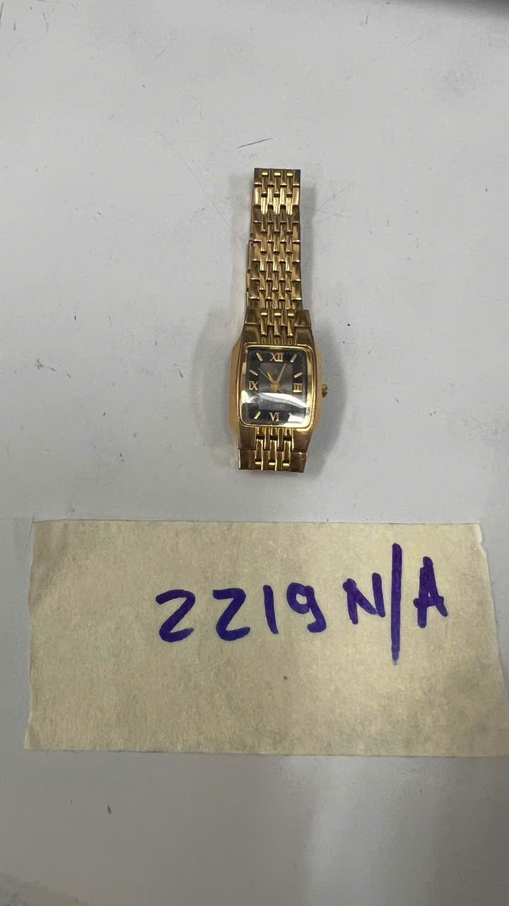 Ngày tiếp nhận: 23/12/2025 Mã hồ sơ: 2219N2025A Mô tả: 01 đồng hồ mặt kim loại vuông màu vàng, logo chữ QUARTZ, dây đeo kim loại màu vàng. |