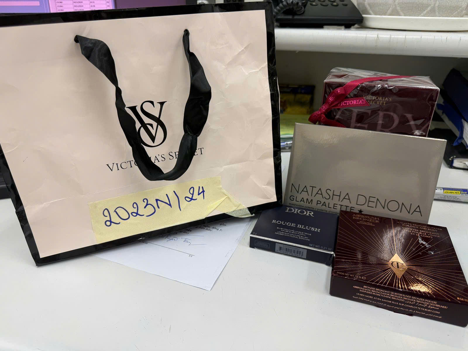 | 6 | 24/11/2024 | 2023N/2024 | 01 túi giấy trắng đựng: 01 hộp phấn DIOR ROUGE BLUSH, 01 hộp giấy NATASHA DENONA màu xanh, 01 hộp giấy AIRBRUSH BRONZER màu đỏ, 01 hộp dầu thơm VICTORIA SECRECT, tất cả còn seal mới nguyên chưa qua sử dụng | ANTTQT | ![]() |
