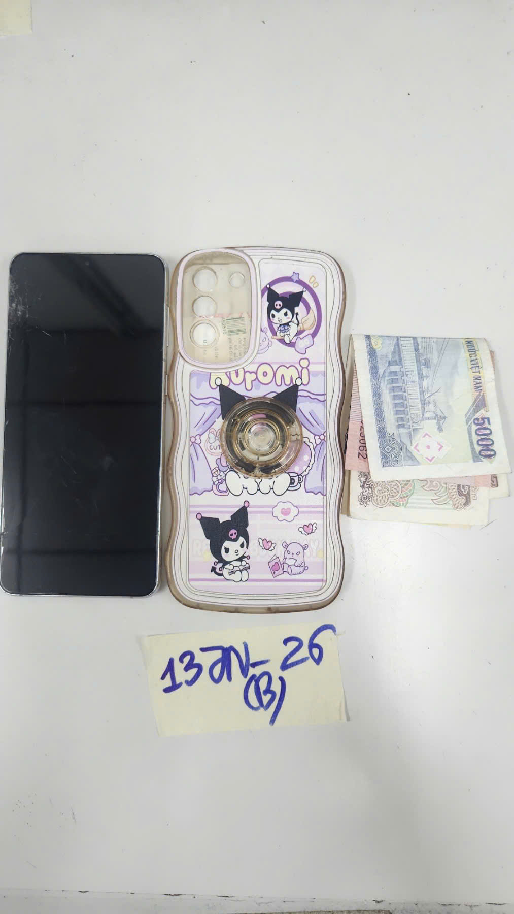 Ngày tiếp nhận: 25/01/2026 Mã hồ sơ: 137N2026B Mô tả: 01 điện thoại Samsung màu bạc, điện thoại bị vỡ màn hình trước và sau, điện thoại hoạt động bình thường, ốp lưng có họa tiết nhân vật hoạt hình, bên trong ốp lưng có 77.000 VND (bảy mươi bảy nghìn đồng). |