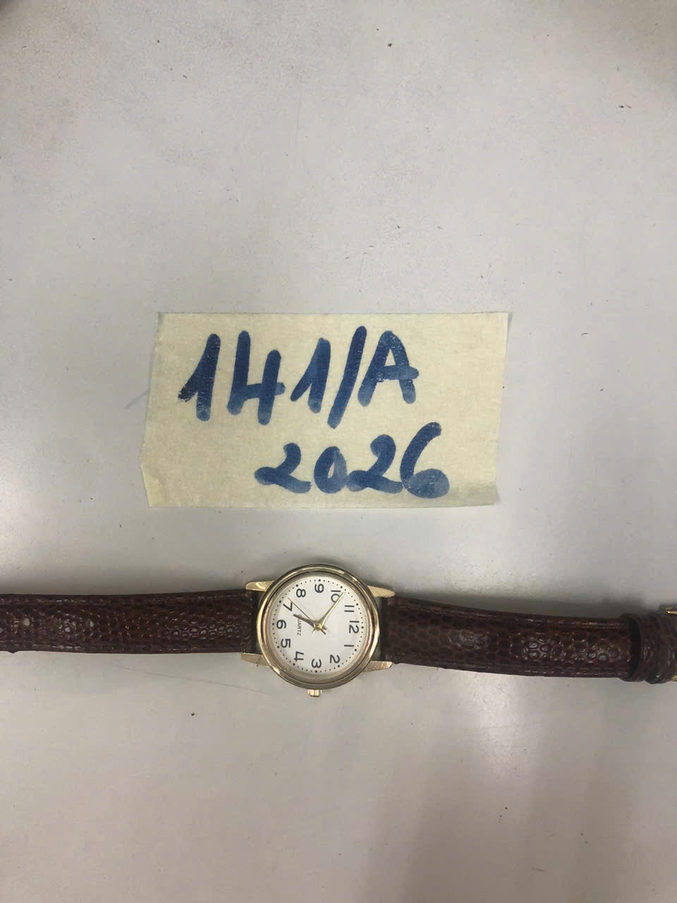 Ngày tiếp nhận: 26/01/2026 Mã hồ sơ: 141N2026A Mô tả: 01 đồng hồ mặt hình tròn màu trắng, viền màu vàng có chữ QUARTZ, dây đeo da màu nâu. |