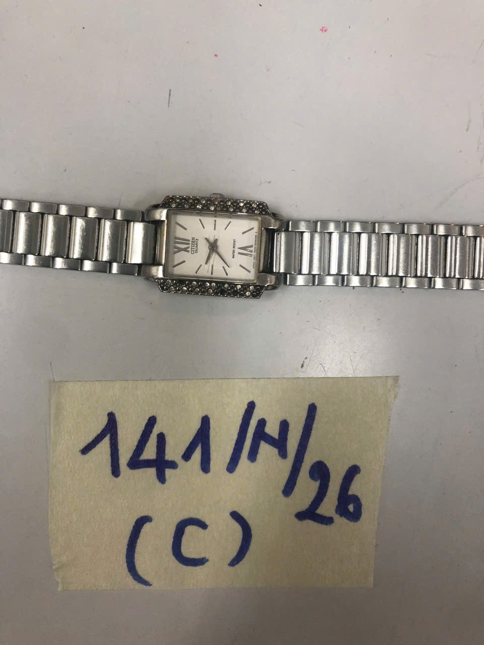 Ngày tiếp nhận: 26/01/2026 Mã hồ sơ: 141N2026C Mô tả: 01 đồng hồ mặt hình vuông màu trắng có chữ CITIZEN QUARTZ, dây đeo kim loại màu trắng. |
