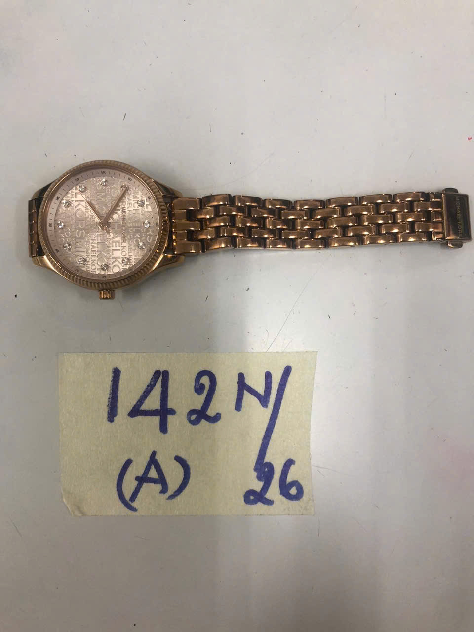 Ngày tiếp nhận: 26/01/2026 Mã hồ sơ: 142N2026A Mô tả: 01 đồng hồ có in dòng chữ MICHEAL KORS dây kim loại màu vàng. |