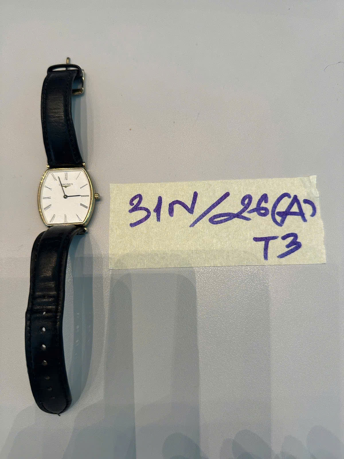 Ngày tiếp nhận: 25/01/2026 Mã hồ sơ: 31N2026A-T3 Mô tả: 01 đồng hồ dây da đen mặt vuông viền kim loại vàng có chữ Longines. |
