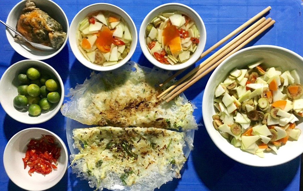 Bánh khoái có vẻ giống bánh xèo Nam bộ về cách chế biến nhưng nguyên liệu thì khác, mang nét đặc trưng của xứ Thanh, bao gồm rau cần, bắp cải, thì là thái sợi nhỏ và tép tươi. Bánh khoái chấm cùng nước mắm pha chua ngọt và sung ghém rất hợp vị.