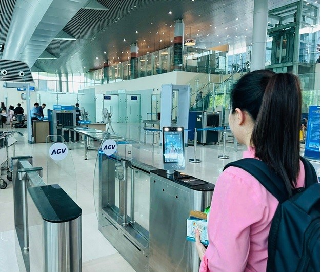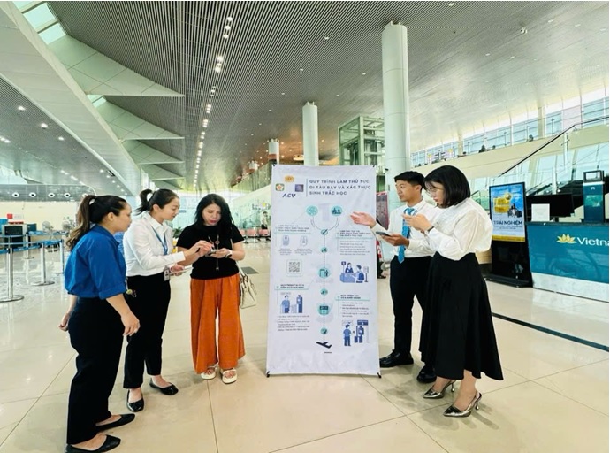Trong quá trình làm thủ tục, hành khách thực hiện theo ba bước cụ thể như sau: Bước 1làm thủ tục và đăng ký dữ liệu khuôn mặt tại quầy làm thủ tục check in, hành khách mở ứng dụng VNeID trên điện thoại cá nhân. Chọn Dịch vụ khác → Thủ tục hàng không → Check-in online và thực hiện theo các bước hướng dẫn trên màn hình. Sau khi hoàn thành check-in trực tuyến, hành khách tiếp tục di chuyển tới khu vực kiểm tra an ninh; Bước 2: Đi qua chốt kiểm tra an ninh tự động, hành khách di chuyển tới khu vực kiểm tra an ninh được trang bị hệ thống sinh trắc học Đứng vào vị trí hướng dẫn có dấu chân, nhìn thẳng vào màn hình camera để hệ thống thực hiện nhận diện khuôn mặt. Sau khi hệ thống xác thực thành công và mở cửa, hành khách tiếp tục di chuyển vào khu vực soi chiếu an ninh; Bước 3: Đi qua cổng lên máy bay, tại cửa ra tàu bay, hành khách thực hiện tương tự: đứng vào vị trí xác định, nhìn vào camera để hệ thống nhận diện. Sau khi xác thực thành công, cửa sẽ tự động mở và hành khách lên tàu bay mà không cần tiếp xúc với nhân viên.