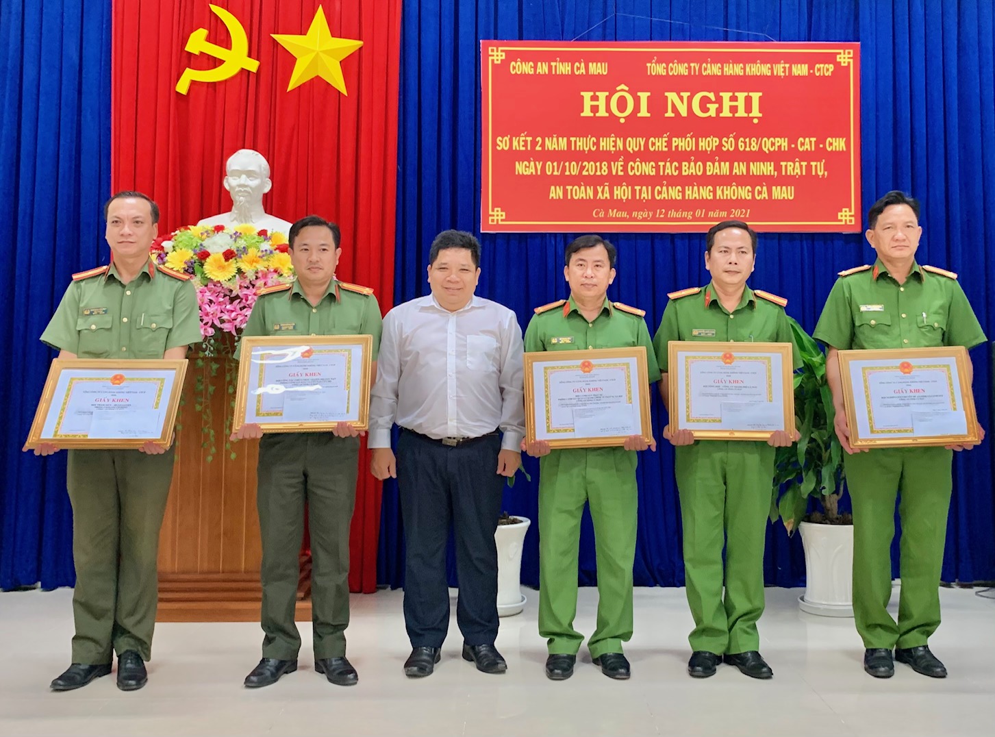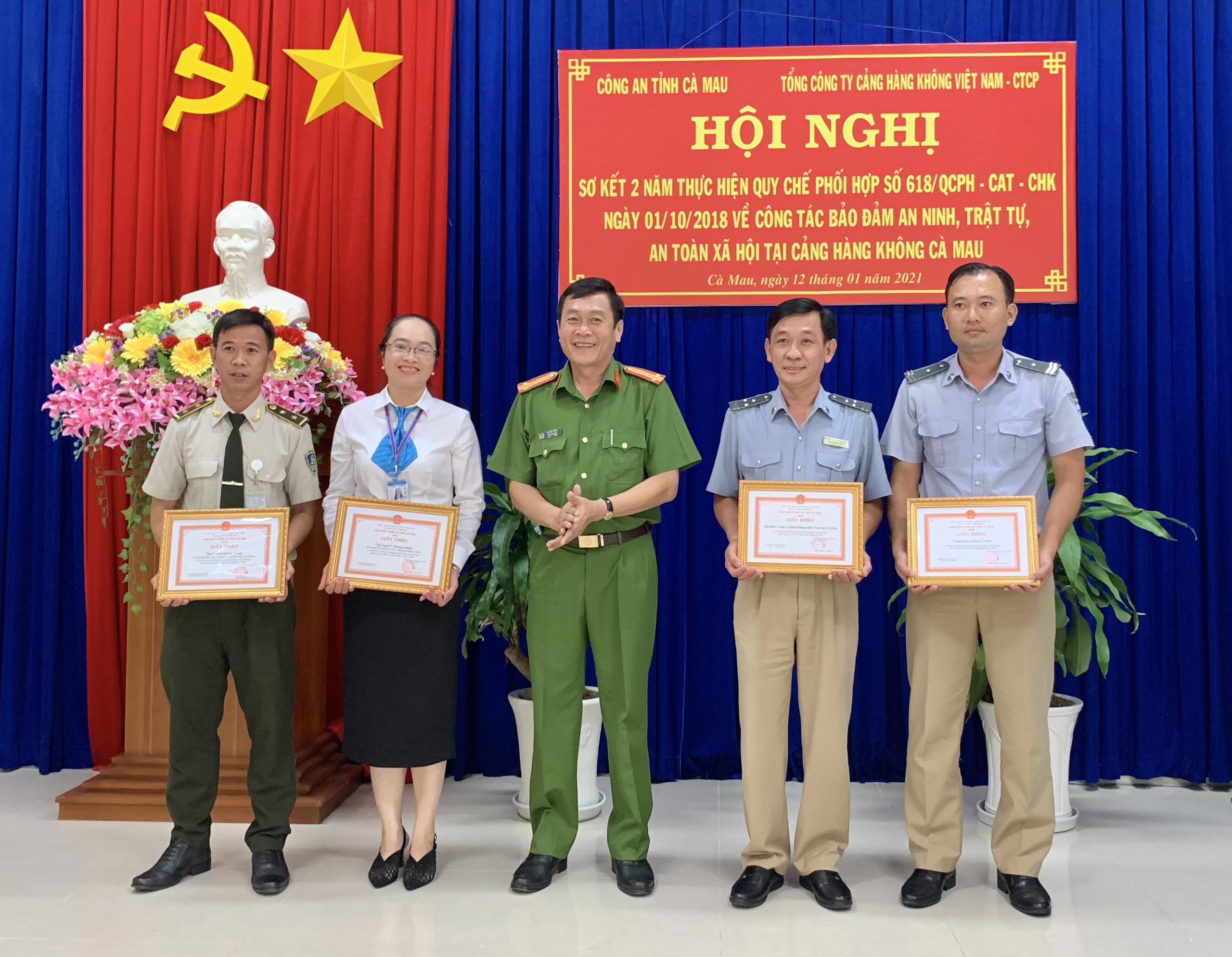 Tại hội nghị, Công an tỉnh Cà Mau và Tổng công ty Cảng hàng không Việt Nam đã trao bằng khen cho các tập thể và các cá nhân có thành tích xuất sắc trong thực hiện Quy chế phối hợp, đảm bảo an ninh, an toàn hàng không và trật tự an toàn xã hội tại Cảng hàng không Cà Mau trong 2 năm qua.