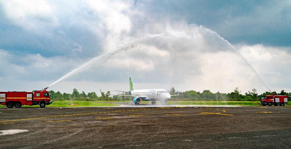 Để chào đón sự kiện này, Cảng hàng không Cà Mau đã thực hiện nghi thức “phun vòi rồng” - một nghi thức trang trọng của ngành hàng không khai trương đường bay mới.