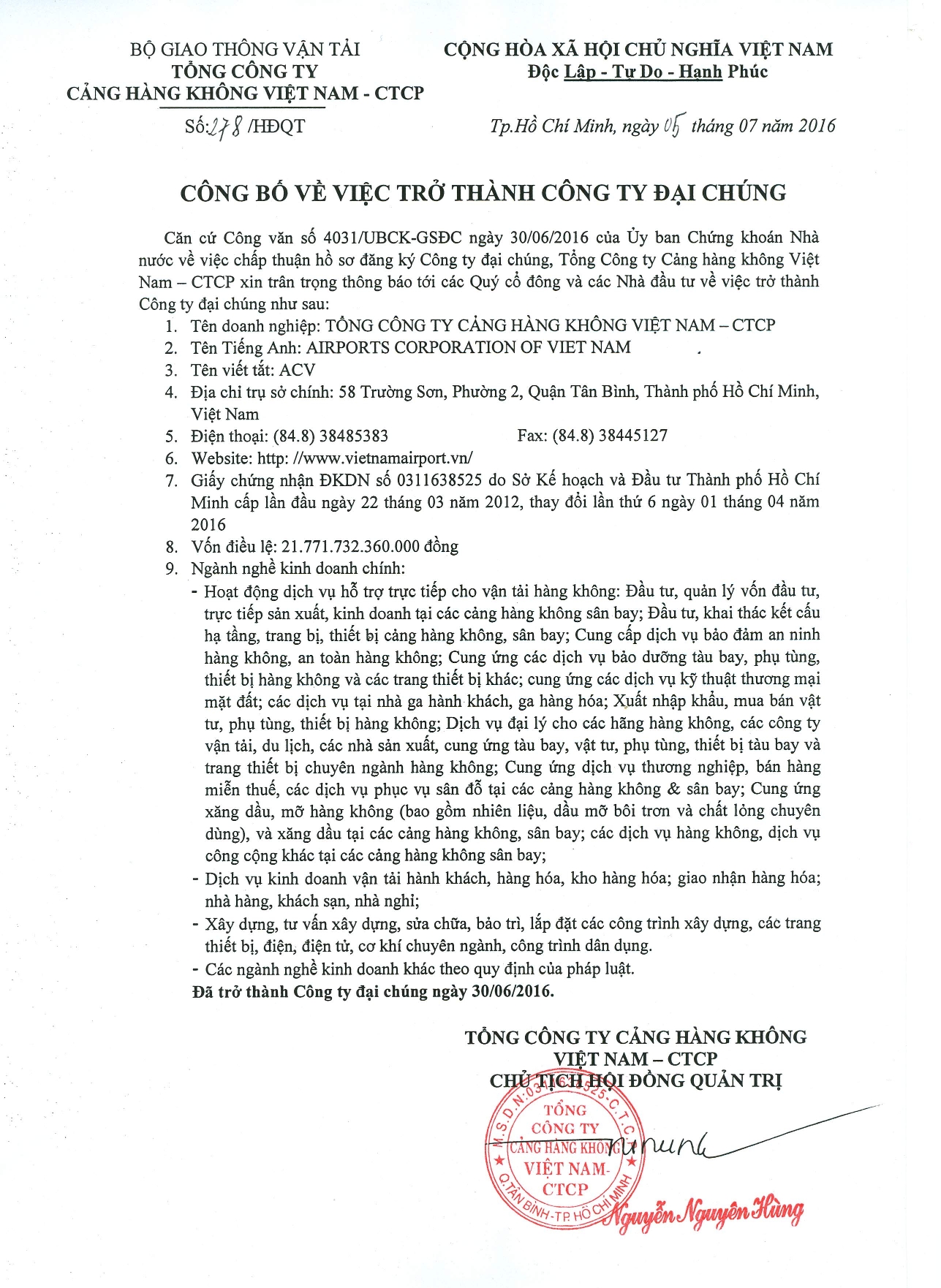 Căn cứ Công văn số 4031/UBCK-GSĐC ngày 30/6/2016 của Ủy ban Chứng khoán Nhà nước về việc chấp thuận hồ sơ đăng ký Công ty đại chúng, ngày 05/7/2016, Tổng công ty Cảng hàng không Việt Nam-CTCP có Công văn số 278/HĐQT trân trọng thông báo tới các Quý cổ đông và các Nhà đầu tư về việc trở thành Công ty đại chúng từ ngày 30/6/2016.