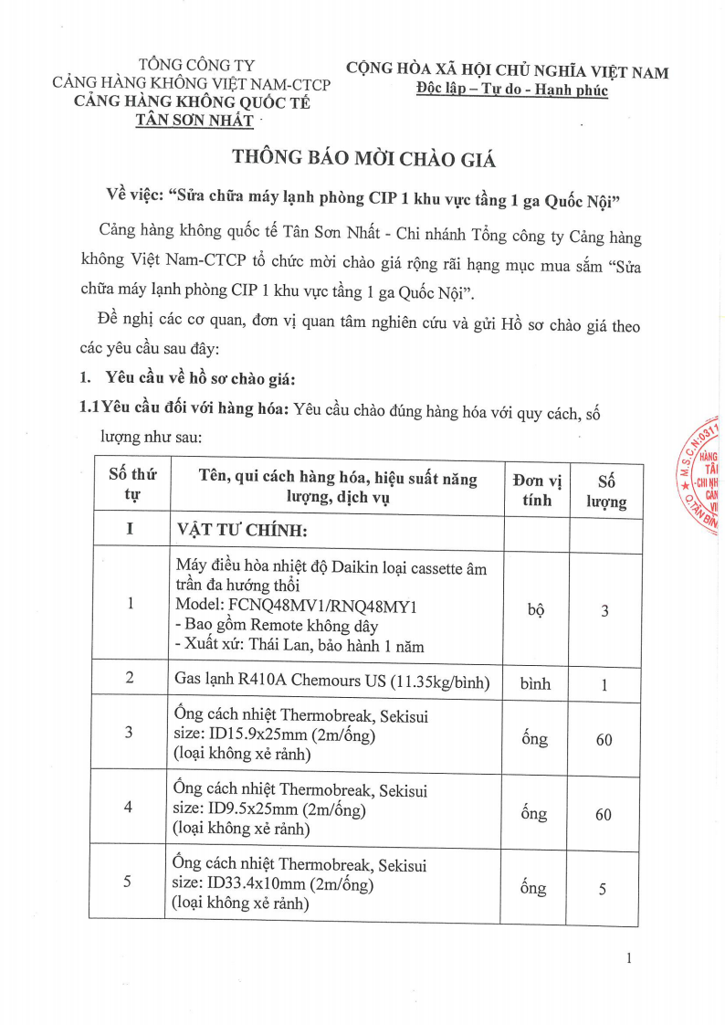 TBMCG:"Sửa chữa máy lạnh phòng CIP 1 khu vực tầng 1 ga Quốc Nội"