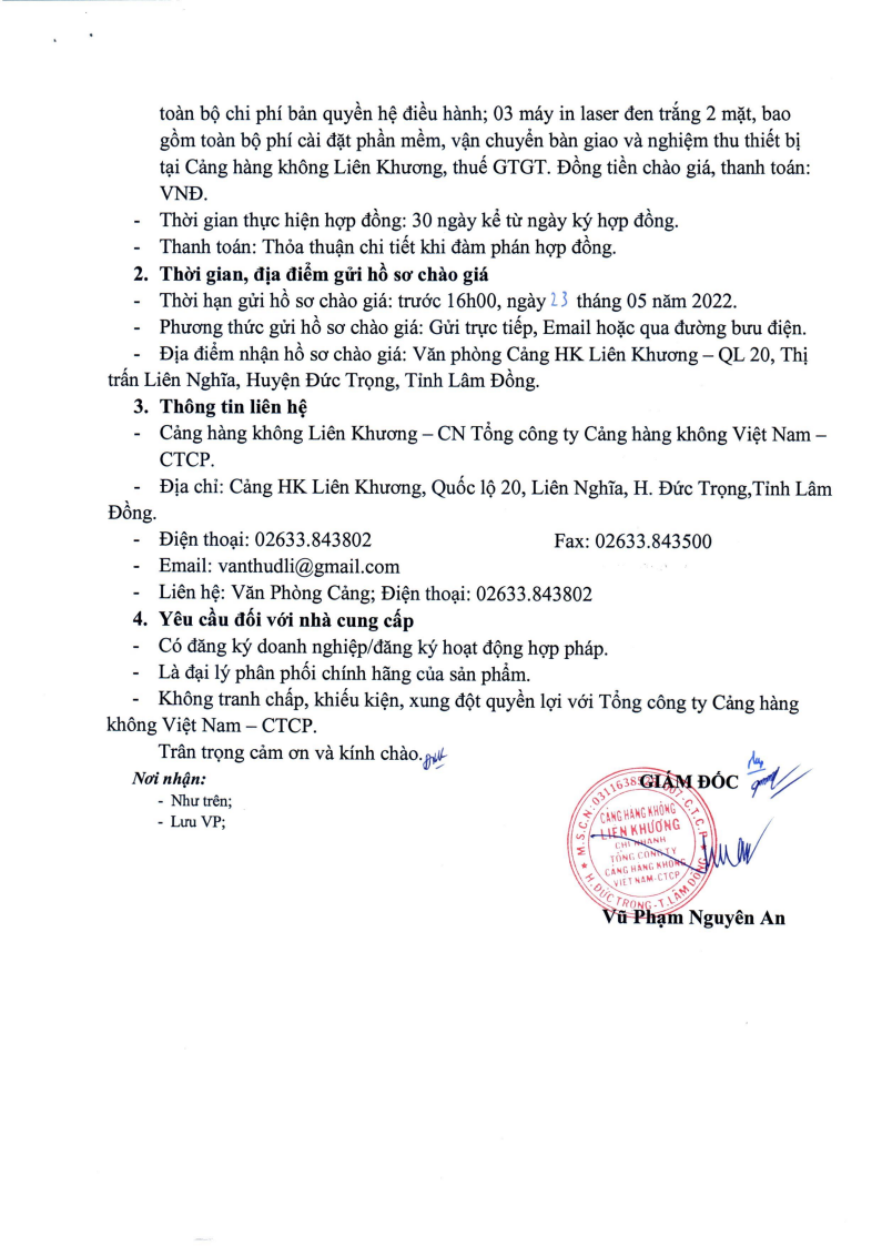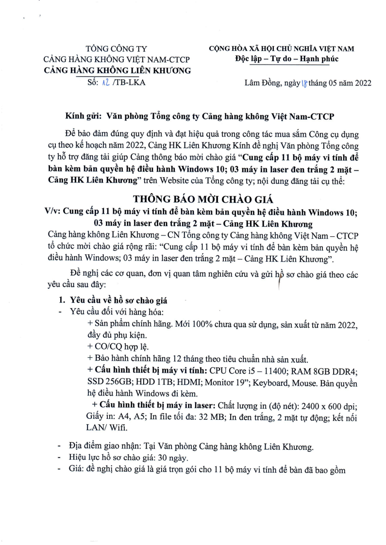 TBMCG: Cung cấp 11 bộ máy vi tính để bàn kèm bản quyền hệ điều hành windows 10, 03 máy in laser đen trắng 2 mặt - Cảng HK Liên Khương