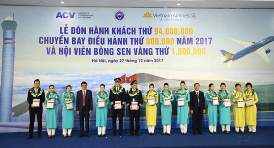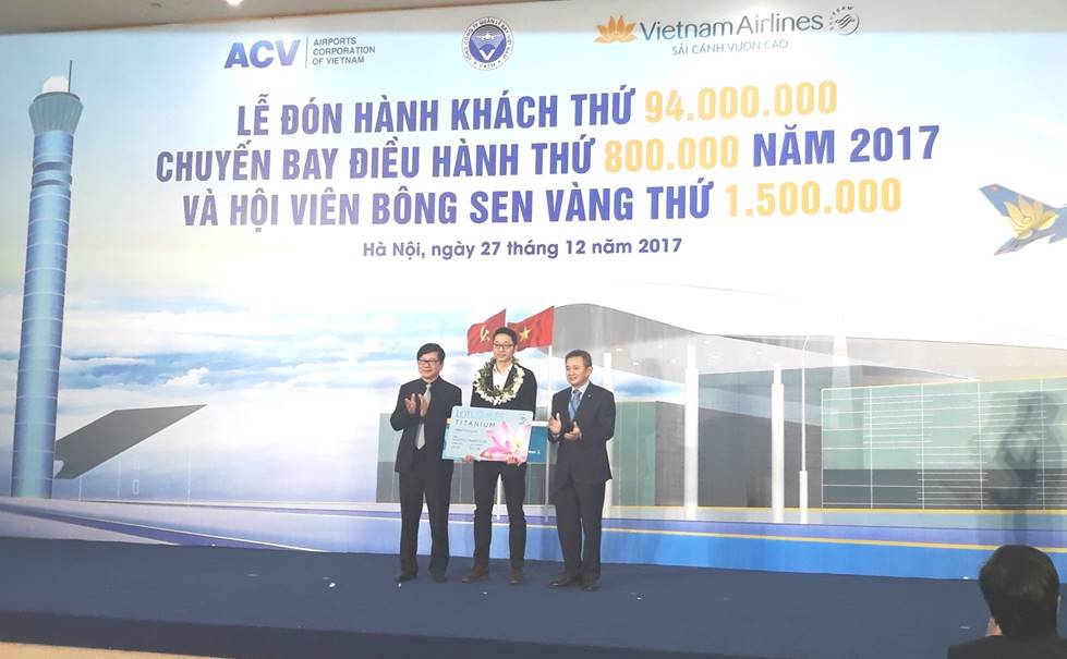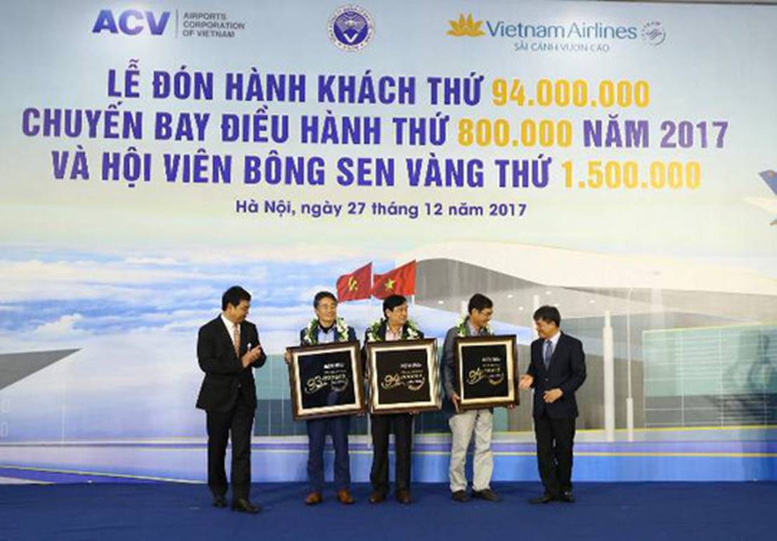 Sáng ngày 27/12/2017, tại Cảng HKQT Nội Bài, Tổng công ty Cảng hàng không Việt Nam – CTCP (ACV) phối hợp với Tổng công ty Quản lý bay Việt Nam (VATM) và Tổng công ty Hàng không Việt Nam - CTCP (Vietnam Airlines) tổ chức Lễ đón hành khách thứ 94 triệu thông qua cảng của ACV trong năm 2017, chuyến bay điều hành thứ 800 nghìn của VATM trong năm 2017 và Hội viên Bông Sen Vàng thứ 1,5 triệu của Vietnam Airlines. Đây là sự kiện quan trọng đánh dấu sự phát triển vượt bậc của ACV, VATM và Vietnam Airlines.