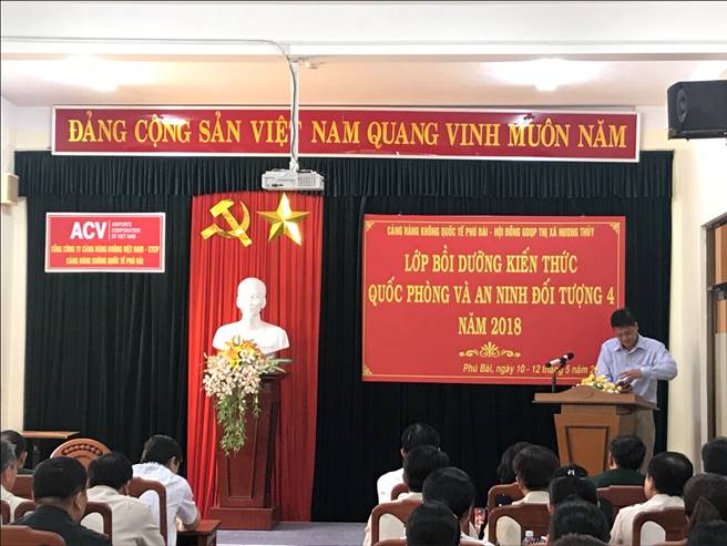 Sáng ngày 10/5/2018, Cảng HKQT Phú Bài đã tổ chức lớp bồi dưỡng kiến thức quốc phòng an ninh cho đối tượng 4 năm 2018. Tham dự khai mạc lớp học có các đồng chí lãnh đạo đến từ Ban Chỉ huy quân sự thị xã Hương Thủy, Trung tâm Bồi dưỡng chính trị thị xã Hương Thủy, Ban Giám đốc Cảng HKQT Phú Bài cùng hơn 200 cán bộ, người lao động Cảng HKQT Phú Bài.