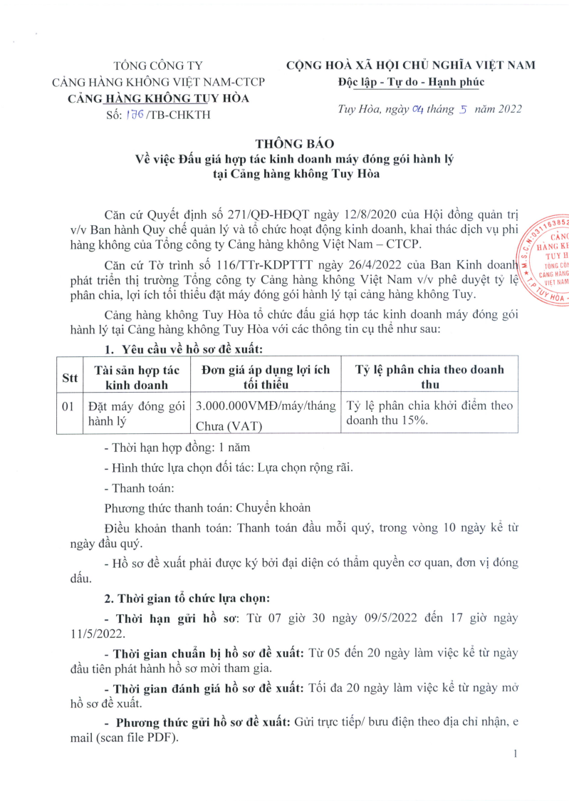 THÔNG BÁO MỜI CHÀO GIÁ (Về việc mời tham gia hạng mục: Hợp tác kinh doanh các dịch vụ: Dịch vụ ăn uống bách hóa tổng hợp, dịch vụ đóng gói hành lý khu vực nhà ga tại Cảng hàng không Tuy Hòa)