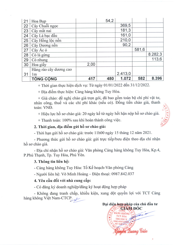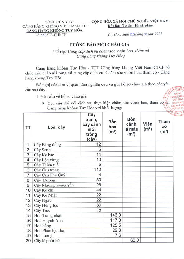 THÔNG BÁO MỜI CHÀO GIÁ (Về việc mời tham gia hạng mục: Hợp tác kinh doanh các dịch vụ: Dịch vụ ăn uống bách hóa tổng hợp, dịch vụ đóng gói hành lý khu vực nhà ga tại Cảng hàng không Tuy Hòa)