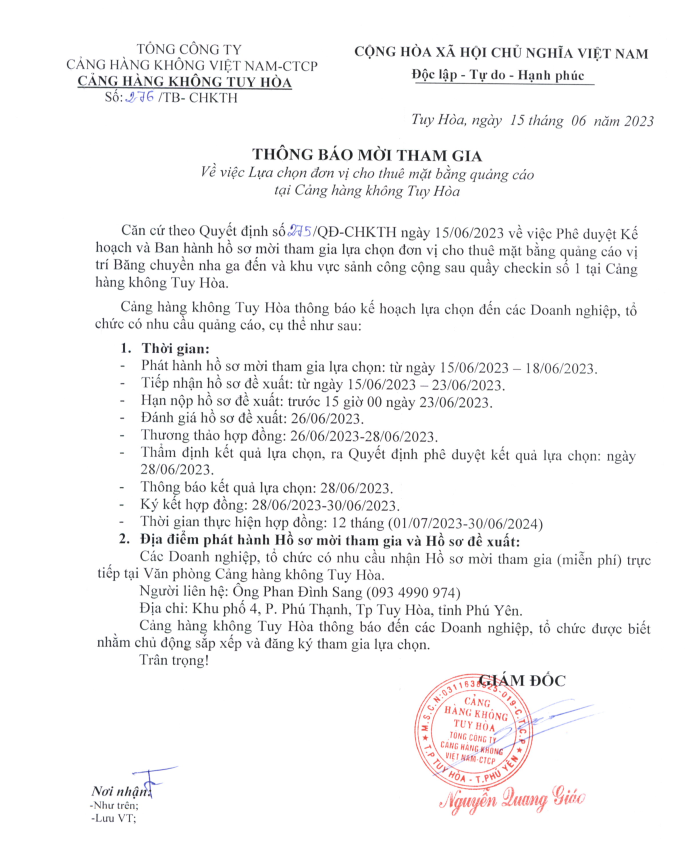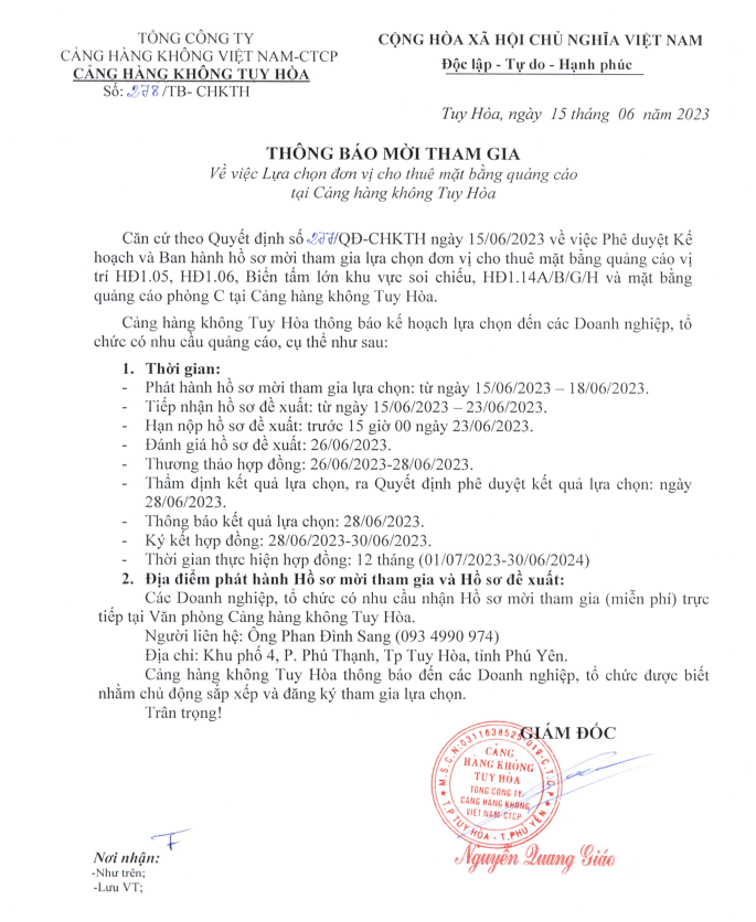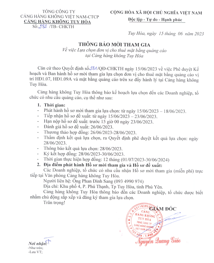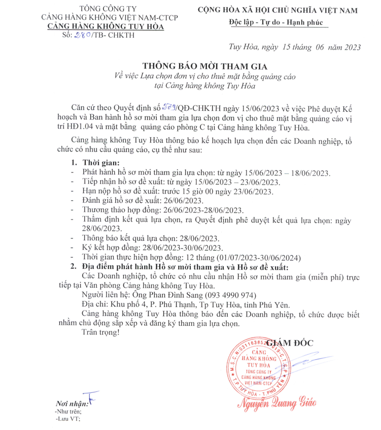 Thông báo mời tham gia V/v Lựa chọn đơn vị cho thuê mặt bằng quảng cáo tại Cảng hàng không Tuy Hòa