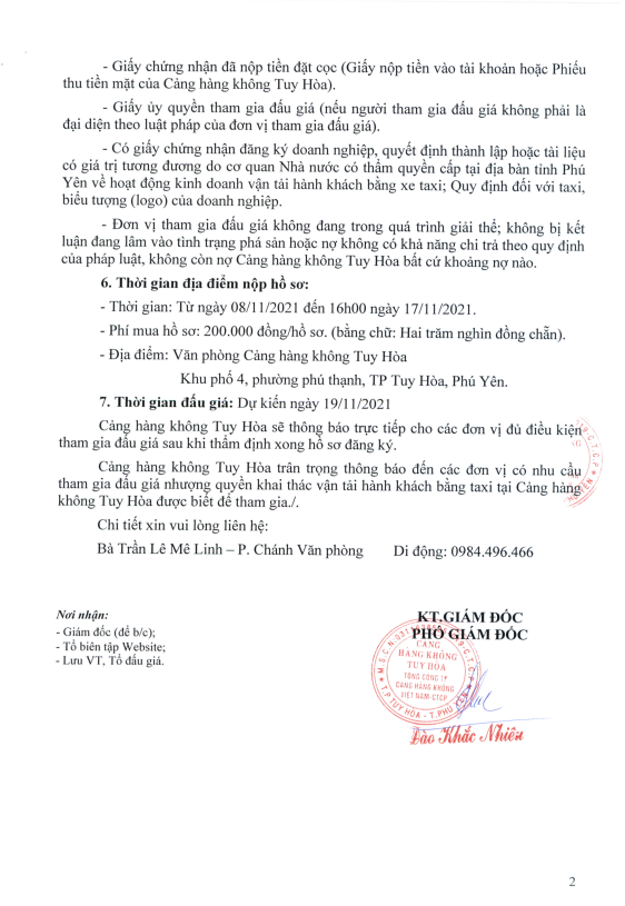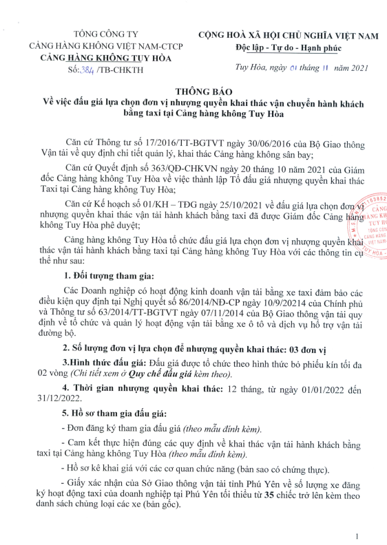 Thông báo: V/v đấu giá lựa chọn đơn vị nhường quyền khai thác vận chuyển hành khách bằng taxi tại Cảng hàng không Tuy Hòa
