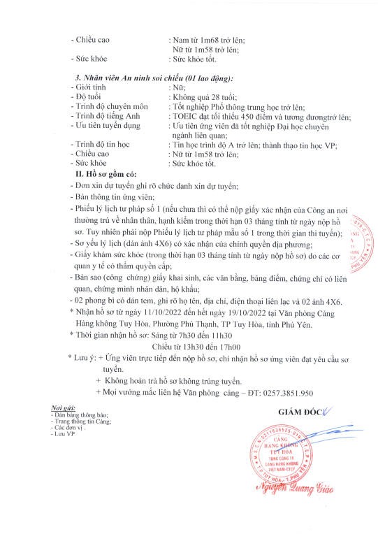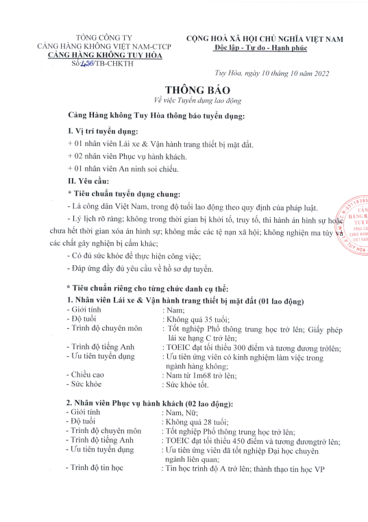 THÔNG BÁO TUYỂN DỤNG LAO ĐỘNG LÀM VIỆC TẠI CHK TUY HÒA 2024