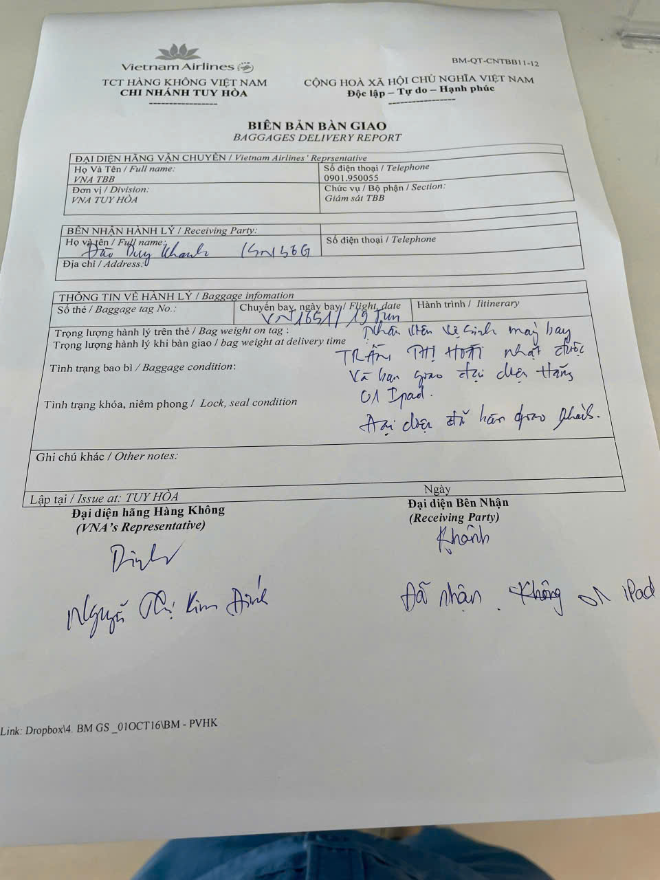 Vào lúc 16h02 ngày 19/06/2025, trên chuyến bay VN1651 từ CHKQT Nội Bài đi đến CHK Tuy Hòa, hành khách Đào Duy Khánh, số ghế 36C, đã bỏ quên 01 IPAD , nhân viên vệ sinh tàu bay Trần Thị Hoài đã phát hiện và nhanh chóng liên hệ với các bên liên quan để thực hiện tìm và trao trả tài sản lại cho hành khác bỏ quên.