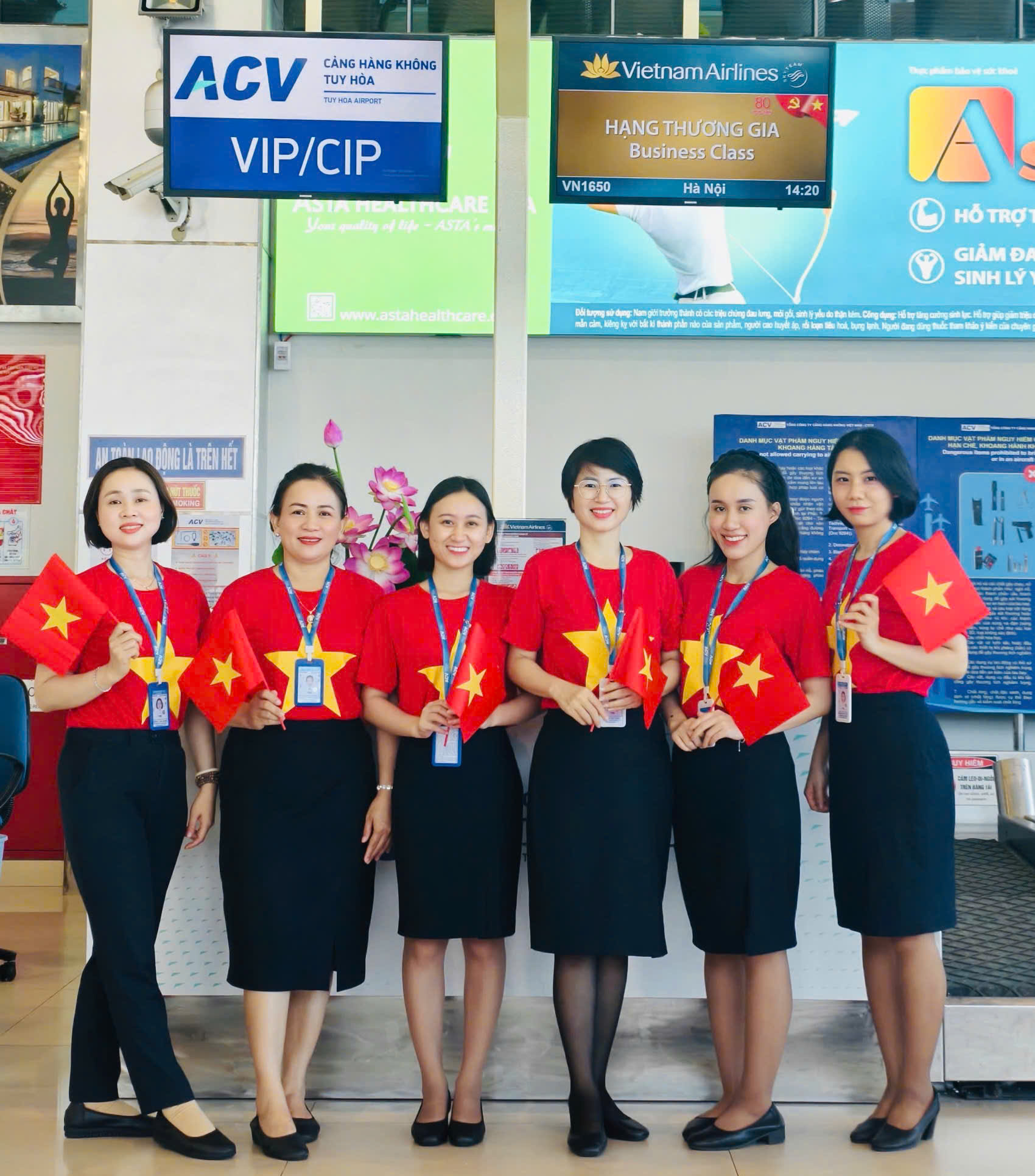 Nhân dịp sự kiện trọng đại của đất nước, đội ngũ cán bộ, nhân viên phục vụ hành khách Cảng hàng không Tuy Hòa đã đồng loạt khoác lên mình chiếc áo cờ đỏ sao vàng, mang đến hình ảnh gần gũi và đầy tự hào dân tộc.