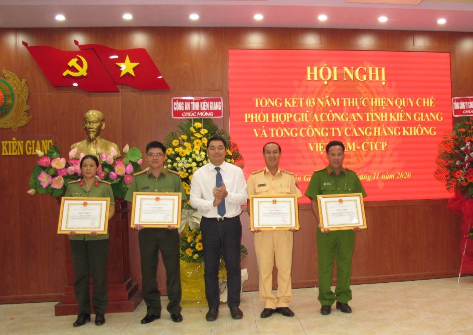 Tại hội nghị, Công an tỉnh Kiên Giang và Tổng công ty Cảng hàng không Việt Nam đã khen thưởng các tập thể và các cá nhân có thành tích xuất sắc trong thực hiện Quy chế phối hợp, bảo đảm an ninh hàng không; an ninh, trật tự an toàn xã hội tại Cảng hàng không Rạch Giá và Cảng HKQT Phú Quốc trong những năm qua.