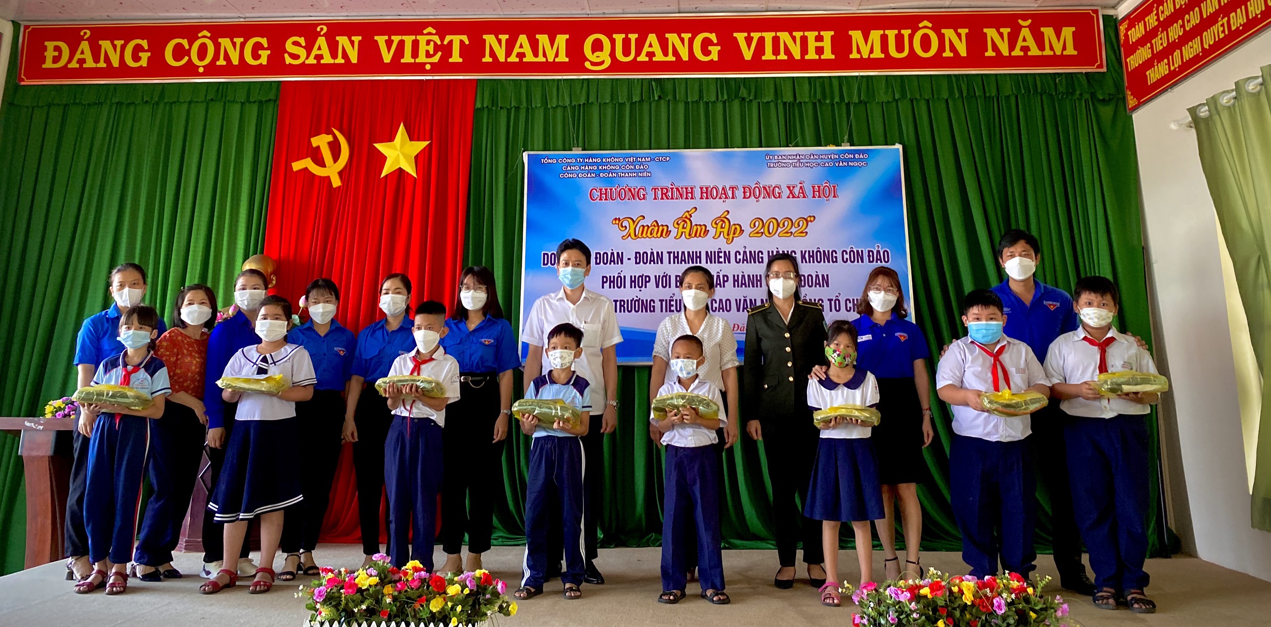 Được sự chấp thuận của Cấp ủy, Ban Giám đốc Cảng hàng không Côn Đảo, ngày 17/01/2022, BCH Công đoàn cơ sở và BCH Chi đoàn Cảng hàng không Côn Đảo đã phối hợp với BCH Công đoàn và BCH chi đoàn Trường Tiểu học Cao Văn Ngọc huyện Côn Đảo tổ chức chương trình từ thiện xã hội với chủ đề “Xuân ấm áp”, trao tặng 32 phần quà trị giá 16 triệu đồng cho các em học sinh nghèo học giỏi. Món quà tuy không lớn về giá trị nhưng là nguồn động viên, kích lệ đối với các em học sinh có hoàn cảnh khó khăn, góp phần giúp các em đón một mùa xuân ấm áp, đồng thời động viên, khích lệ các em nỗ lực hơn nữa trong học tập.