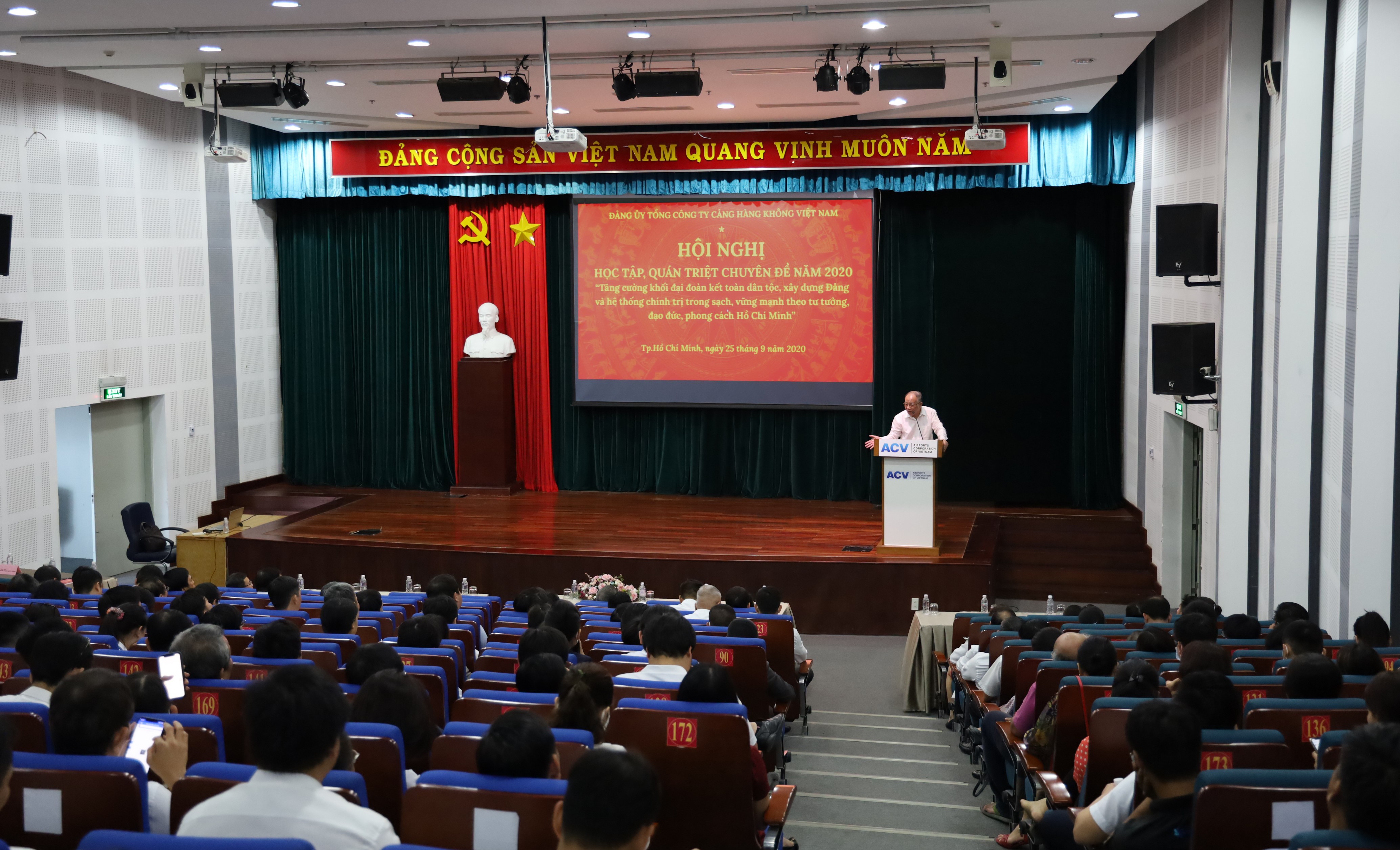 Ngày 25/9/2020, tại Trụ sở Tổng công ty, Đảng ủy Tổng công ty Cảng hàng không Việt Nam (ACV) đã tổ chức Hội nghị học tập, quán triệt chuyên đề năm 2020 “Tăng cường khối đại đoàn kết toàn dân tộc, xây dựng Đảng và hệ thống chính trị trong sạch, vững mạnh theo tư tưởng, đạo đức, phong cách Hồ Chí Minh”.