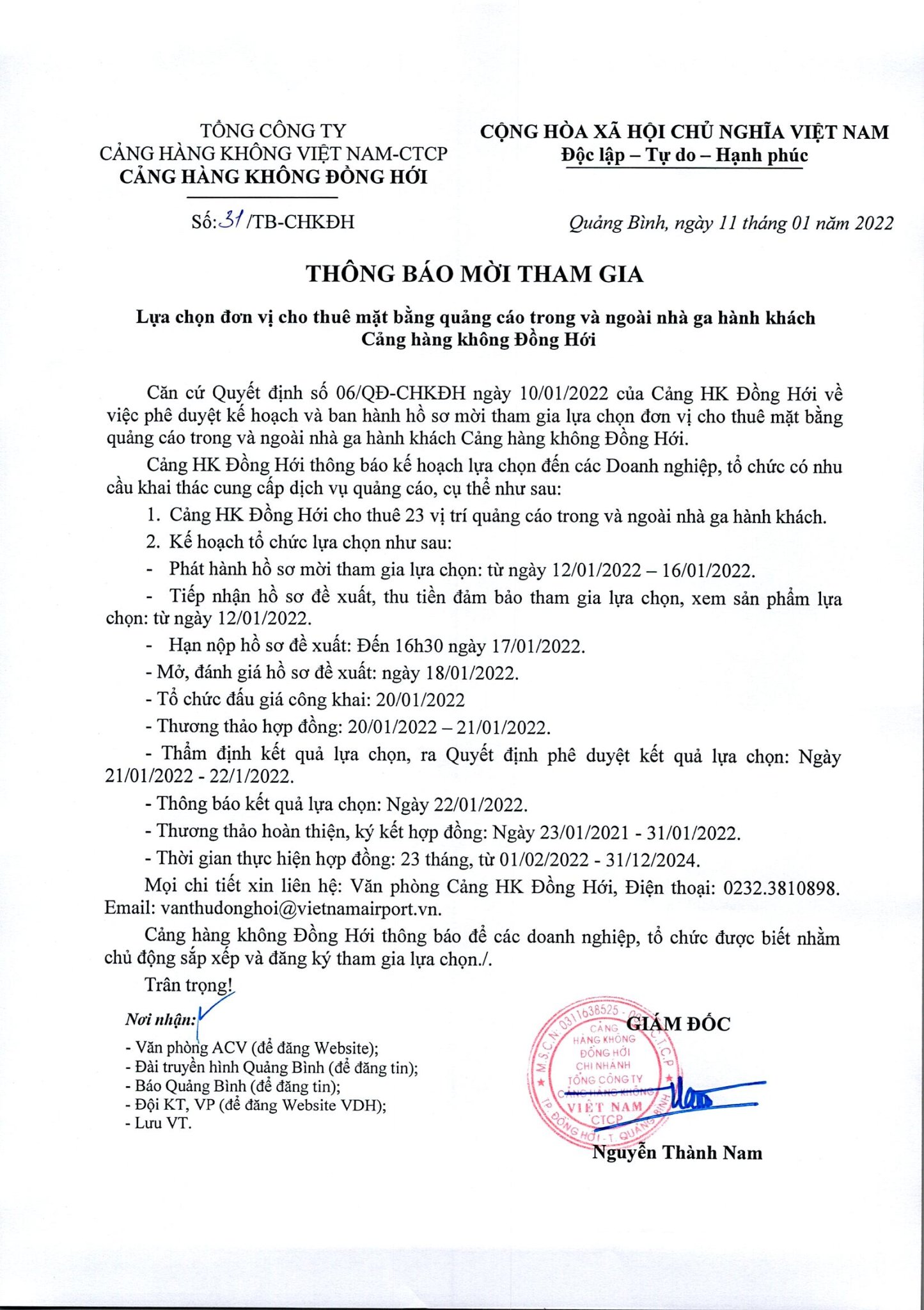 Mời tham gia lựa chọn đơn vị cho thuê mặt bằng quảng cáo trong và ngoài nhà ga hành khách Cảng hàng không Đồng Hới